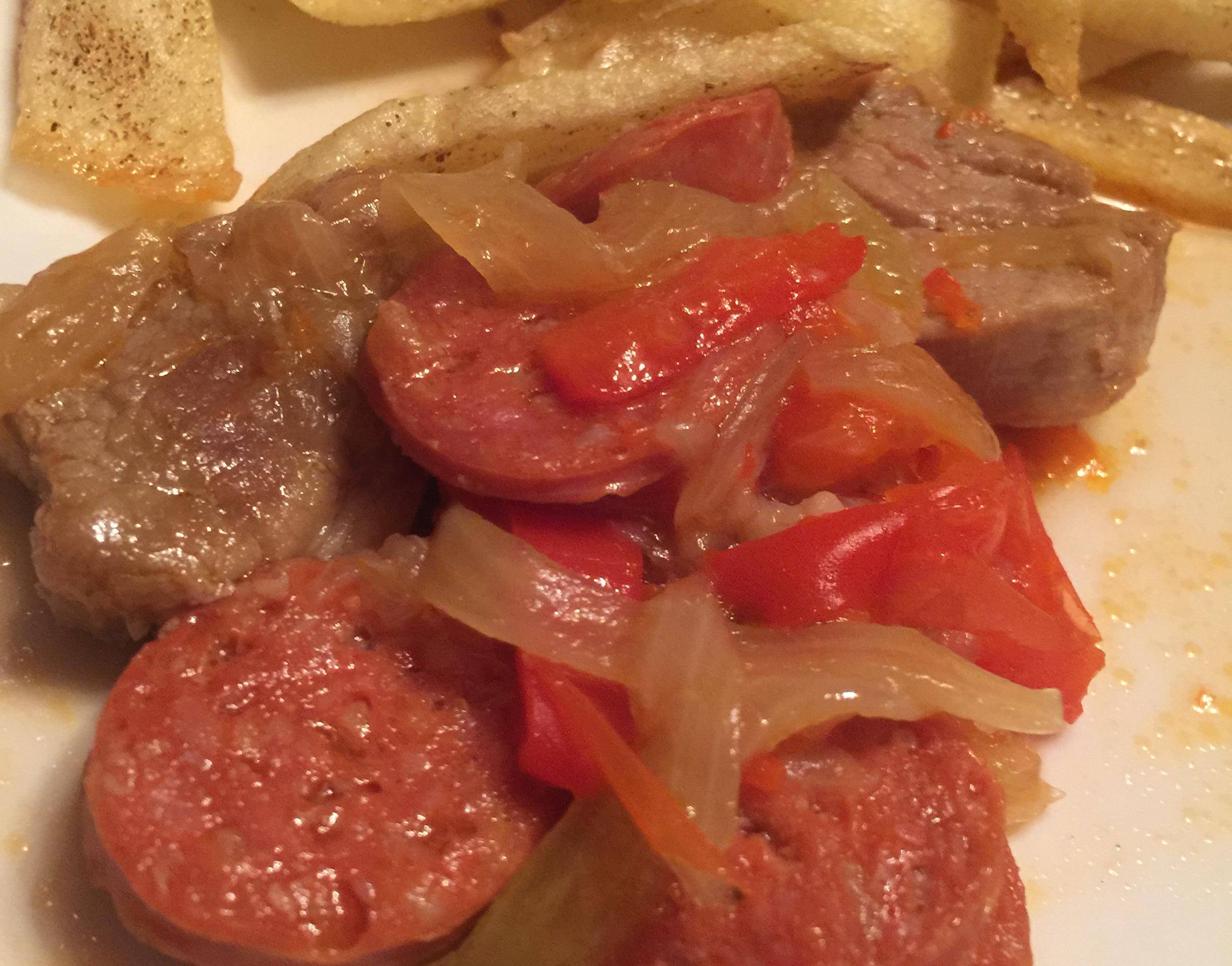 Incorporer les rondelles de chorizo et les lamelles de poivrons, ajouter l’eau et les cubes