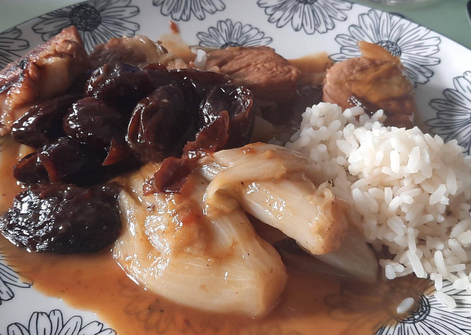 Rajouté les échalotes, les pruneaux, sel, poivre, mélangé et ajouté le fond de veau.