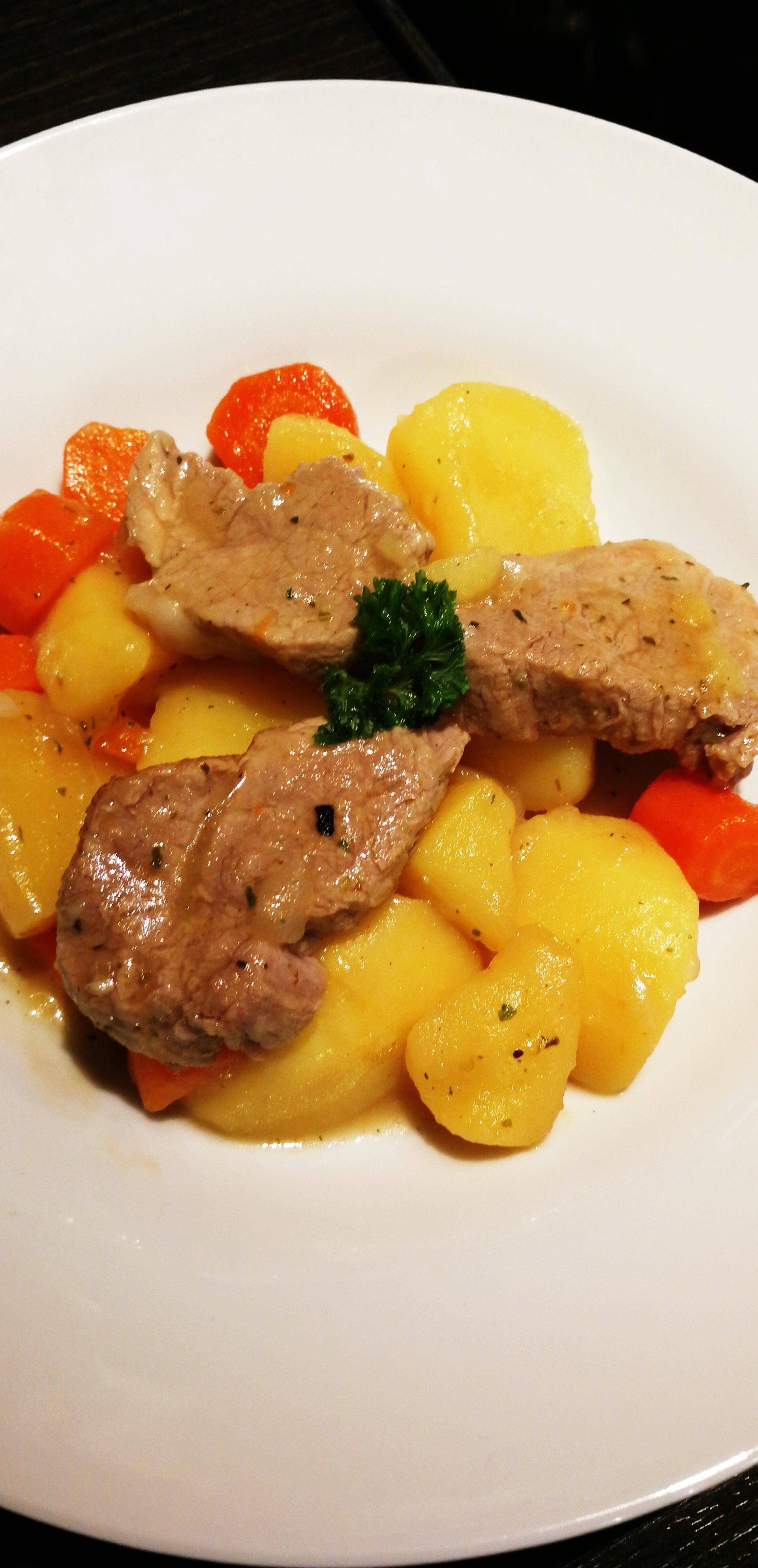 Filet mignon de porc sur son lit de pommes de terre et carottes