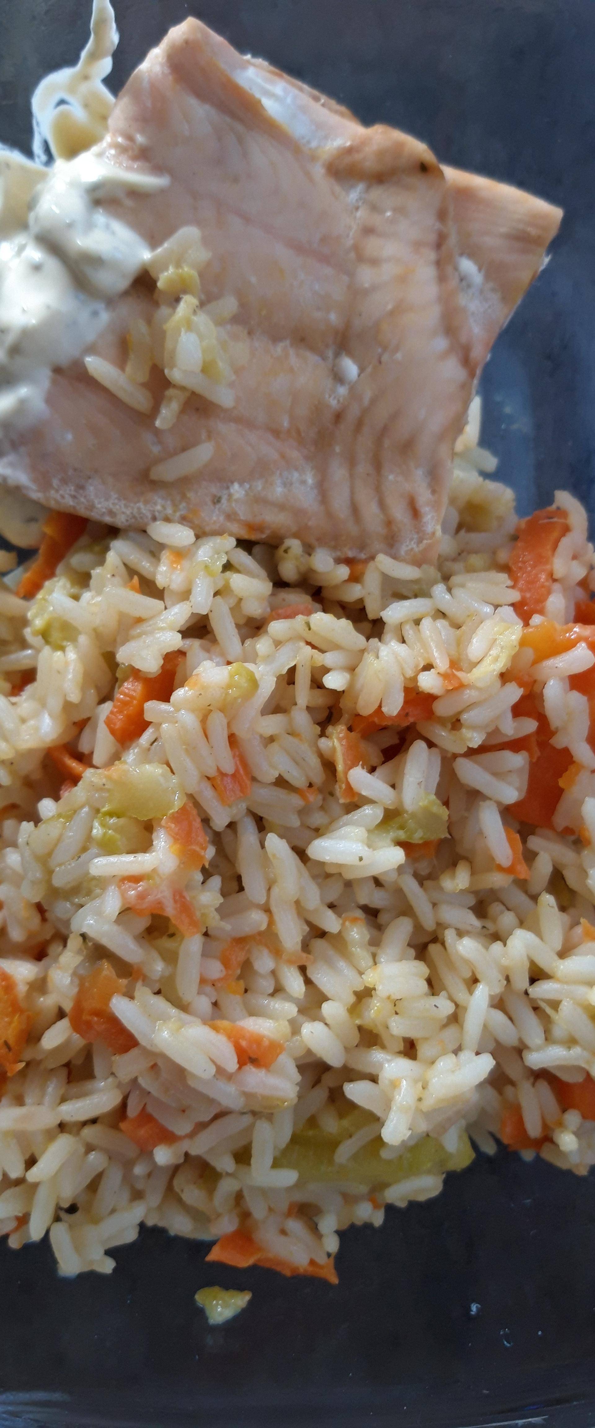 Déposer 4 filets de saumon dans le panier vapeur et le poser sur le melanger riz legumes