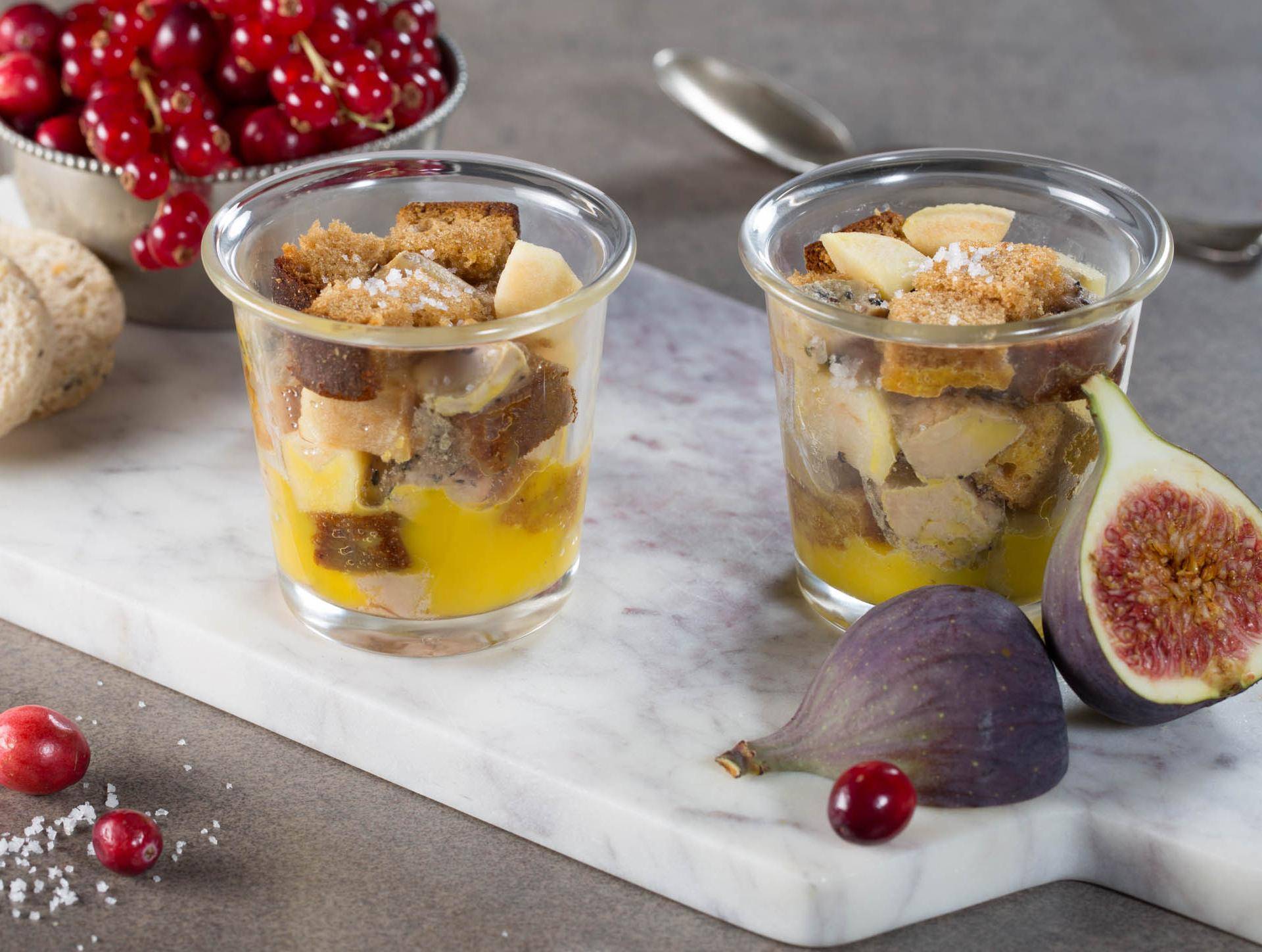 Saler et poivrer le foie gras. Le répartir dans les verrines en insérant les dés de pomme et de pain d’épices.