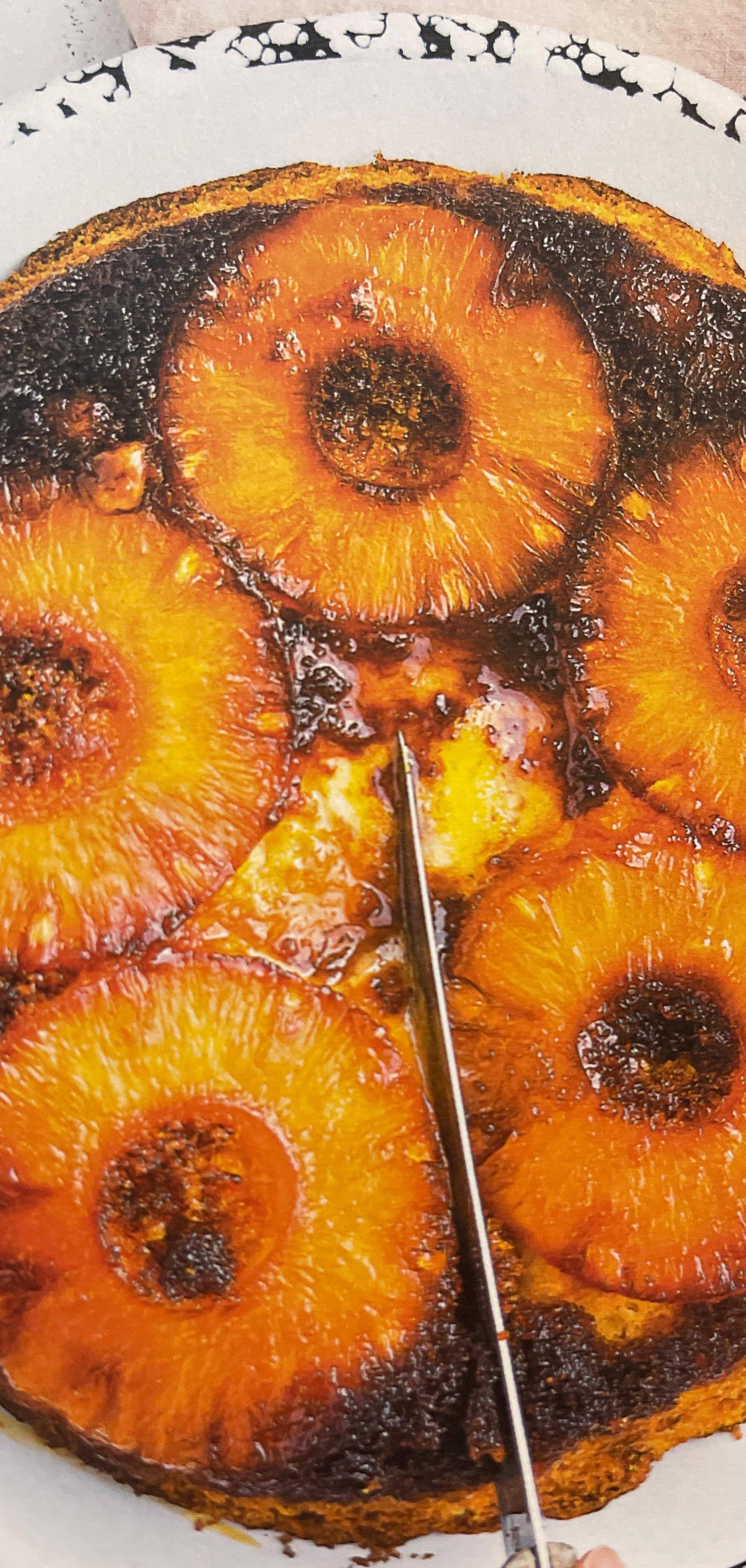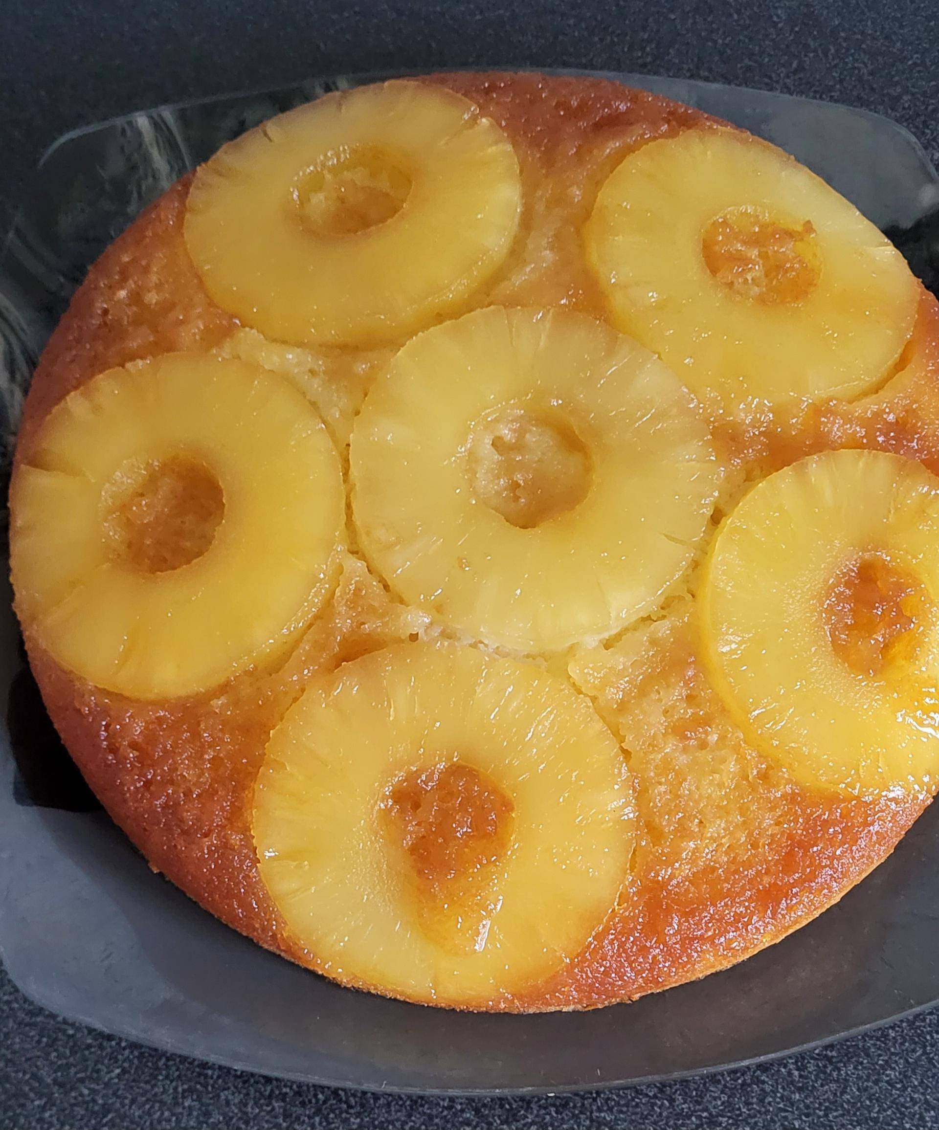 Disposez 6 tranches d'ananas en rond directement sur le caramel. Découpez le reste des tranches en petits morceaux.