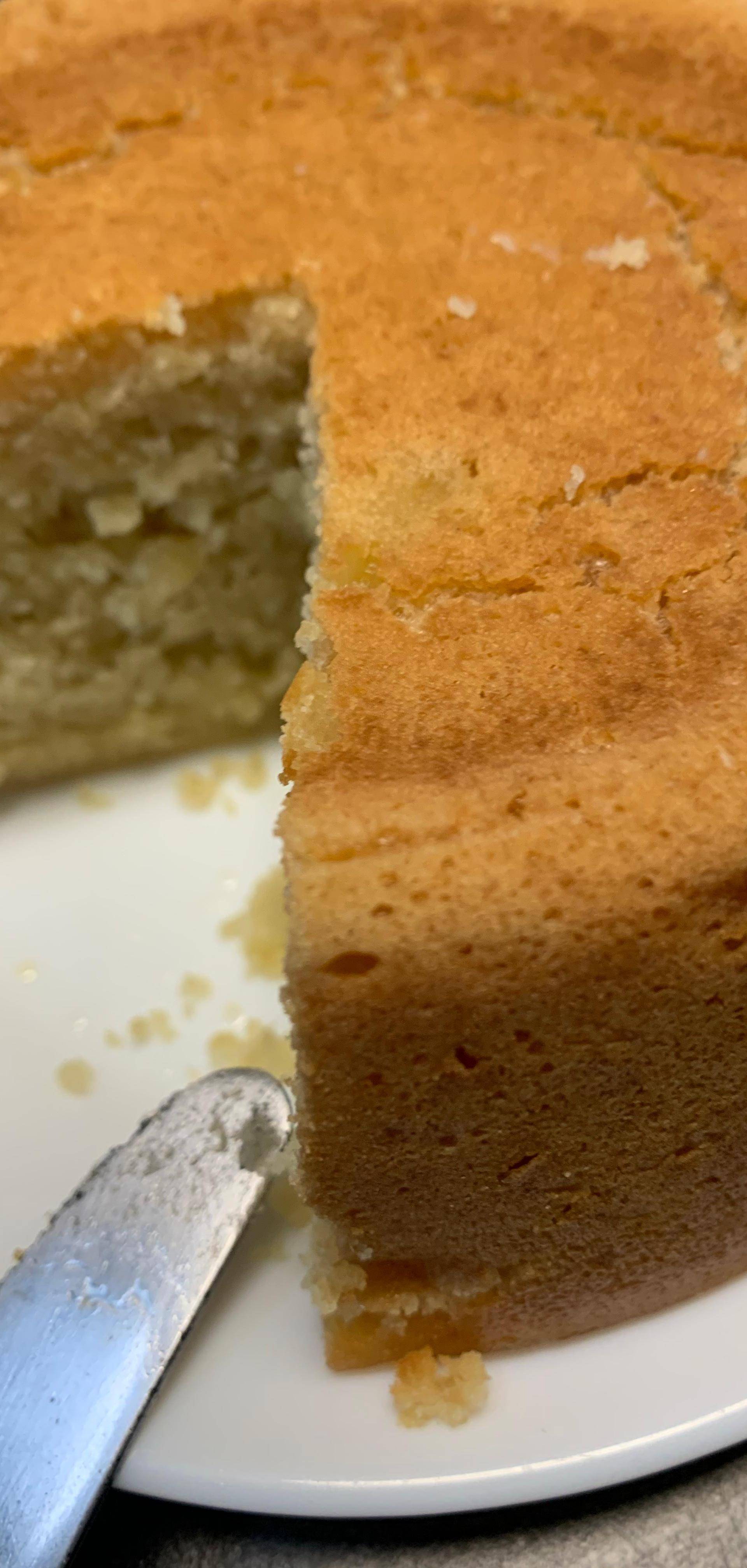 Dans un saladier mélangez le sucre, farine,levure,les oeufs, le beurre et les pommes à la fin.