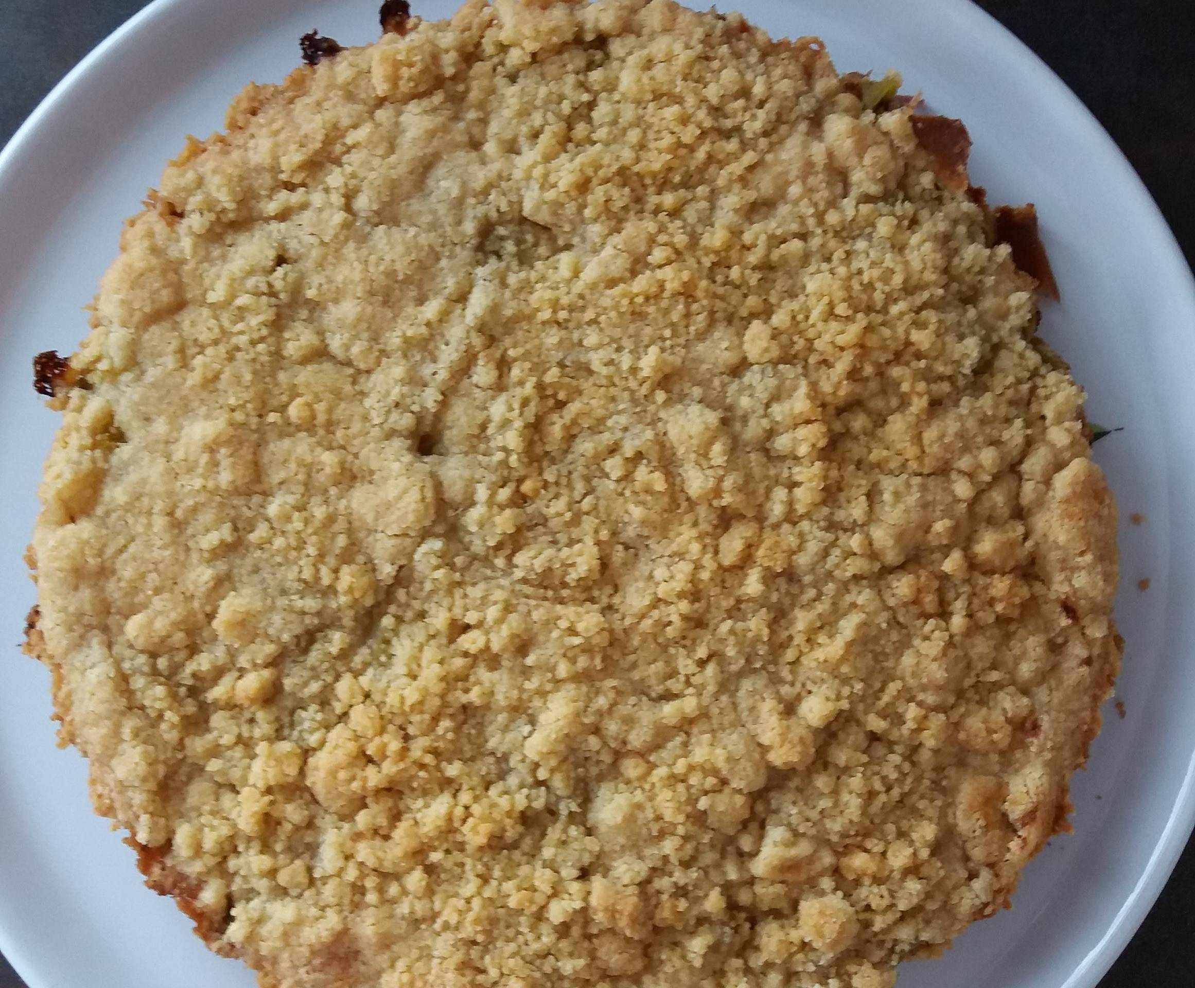 Dans le robot muni du couteau pétrir concasseur mettre 130g de farine avec 100g de beurre coupé en morceaux et 100g de cassonade. Mettre vitesse 8 pendant 1min30. Recouvrer la rhubarbe avec. Faire cuire environ 40 à 45 minutes