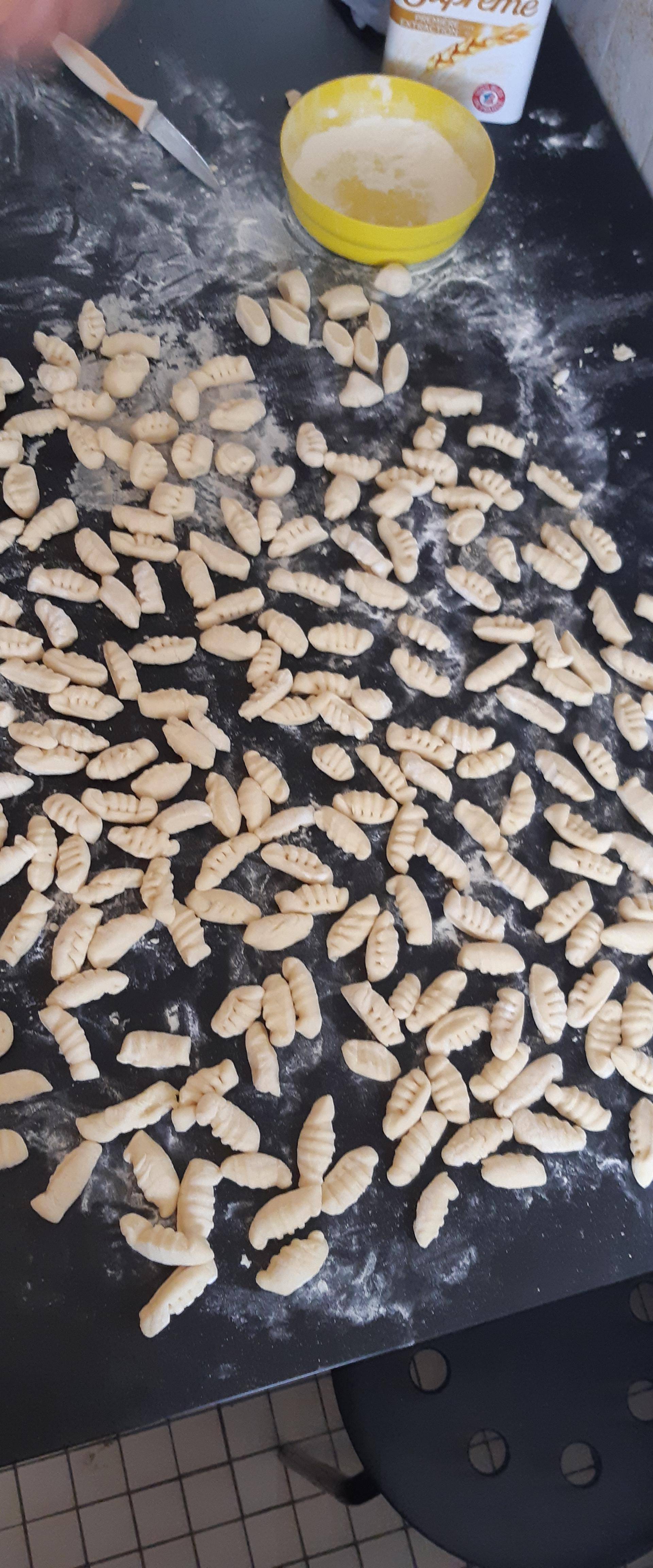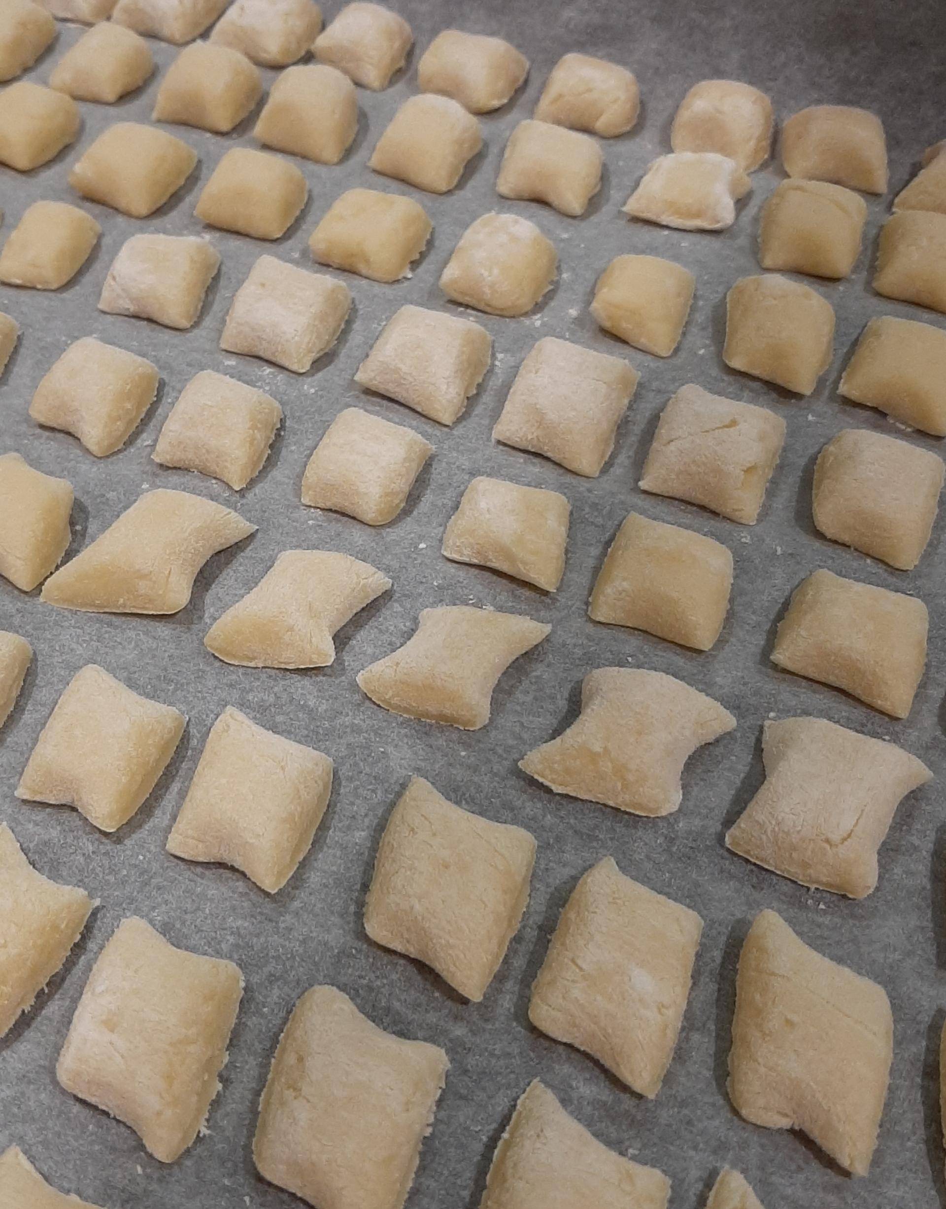 Former des boudins avec la patte puis les couper en tronçons de 1 Cm. Dans le creux de la main faire rouler avec une fourchette afin de donner une forme à votre gnocchi.