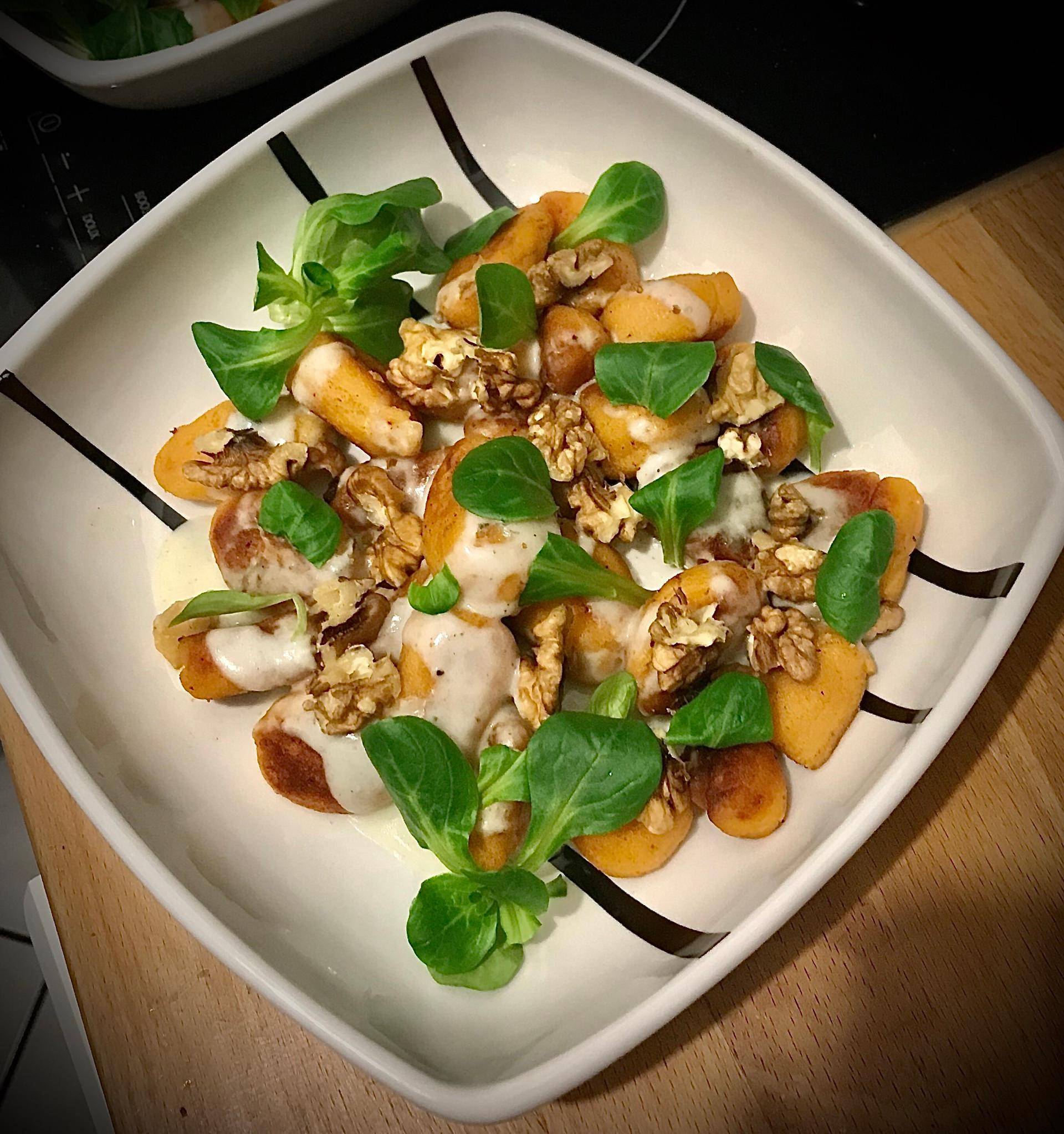 Dressage. Disposer les gnocchis dorés dans l’assiette. Verser un peu de sauce au roquefort dessus. Disposer les cerneaux de noix et agrémenter de quelques feuilles de mâche. Dégustez !
