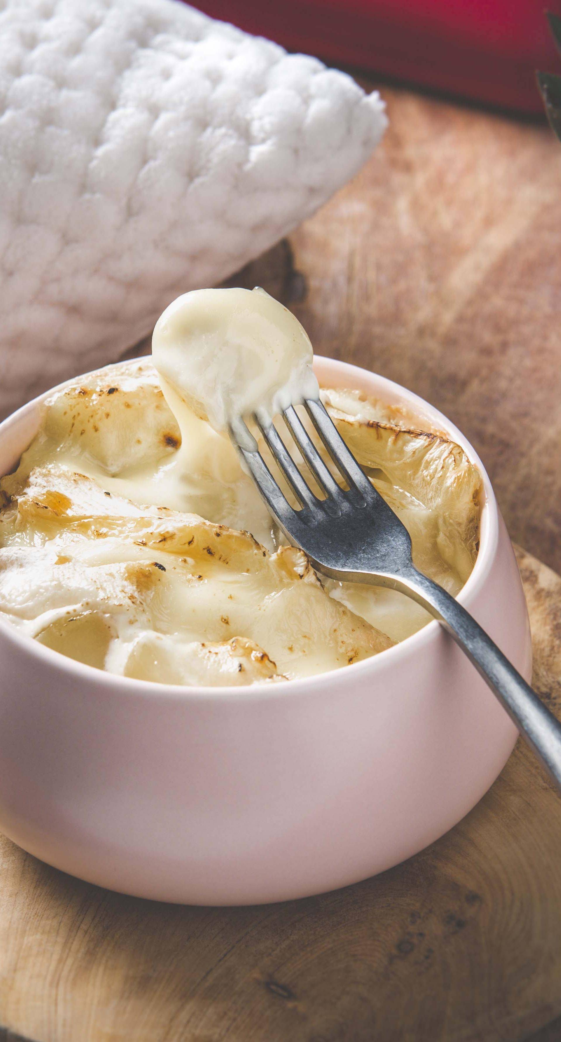 Ajouter la crème, verser dans un plat. Garnir de lamelles de Mont d'Or. Gratiner au four.