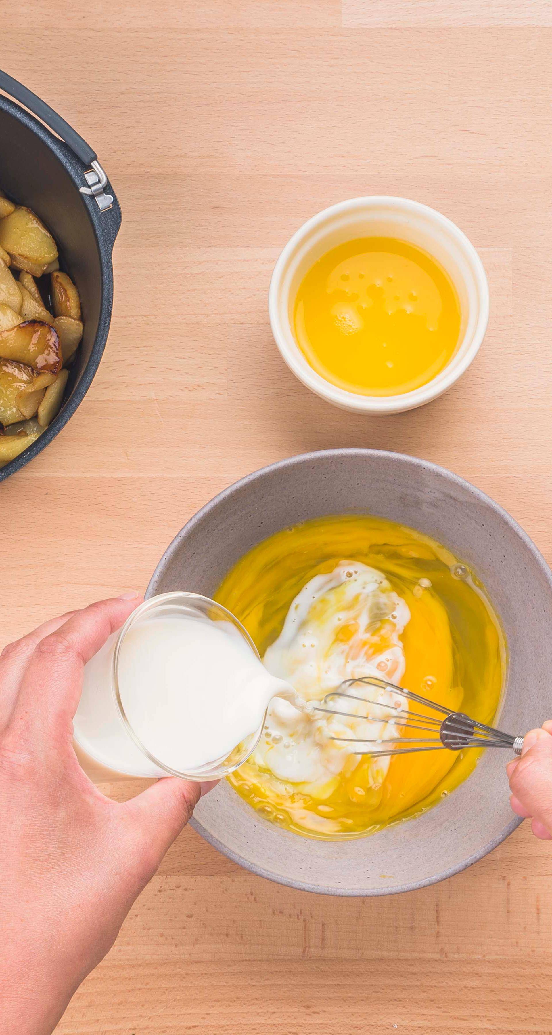 Battre les œufs et le lait, la moitié du sucre et la moitié du beurre fondu. Ajouter le pain. Laisser imbiber 10 min.
