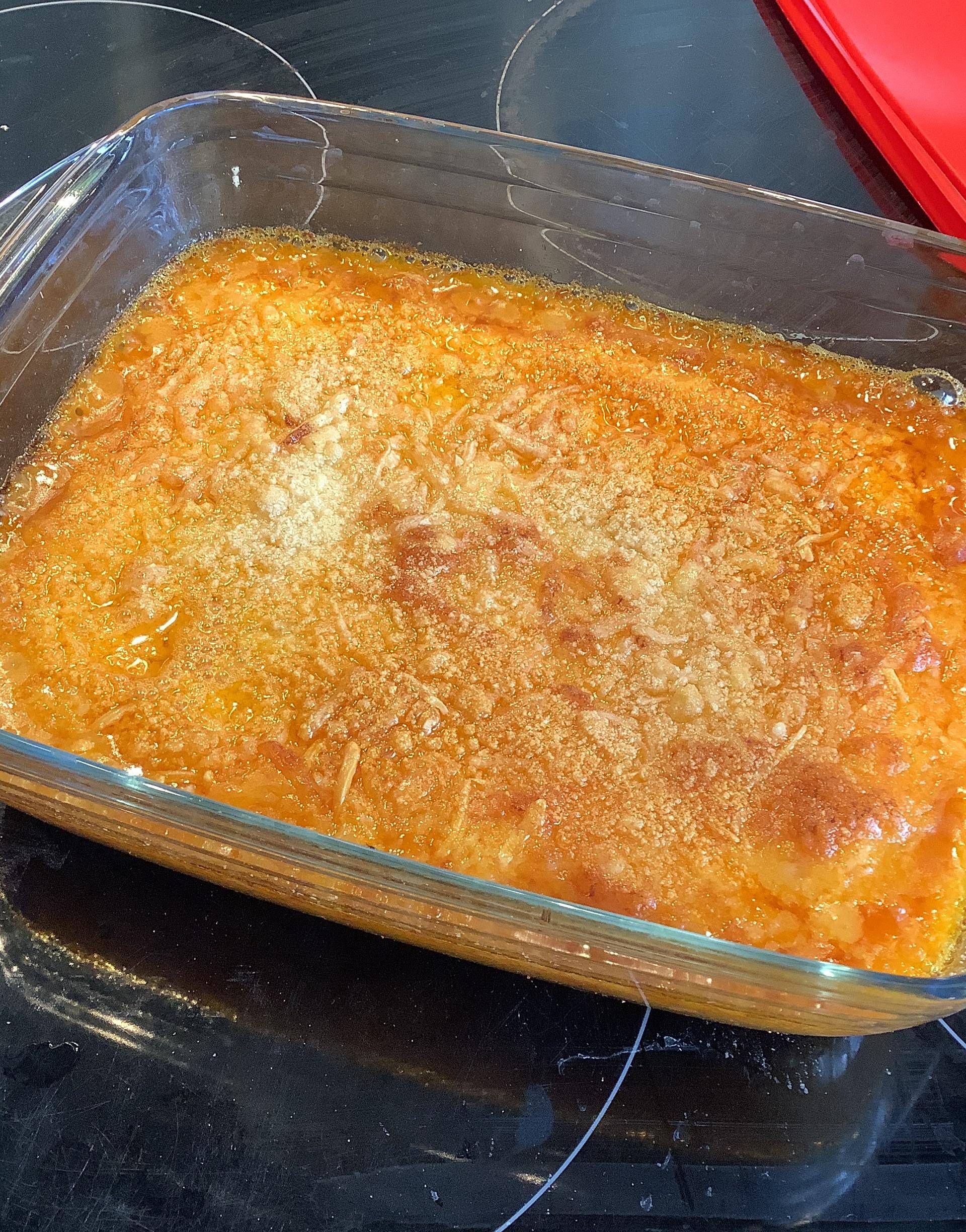 Enfournez le plat, mettez sur mode grill votre four a 220°C. Laissez jusqu’à ce que le gouda soit gratiné