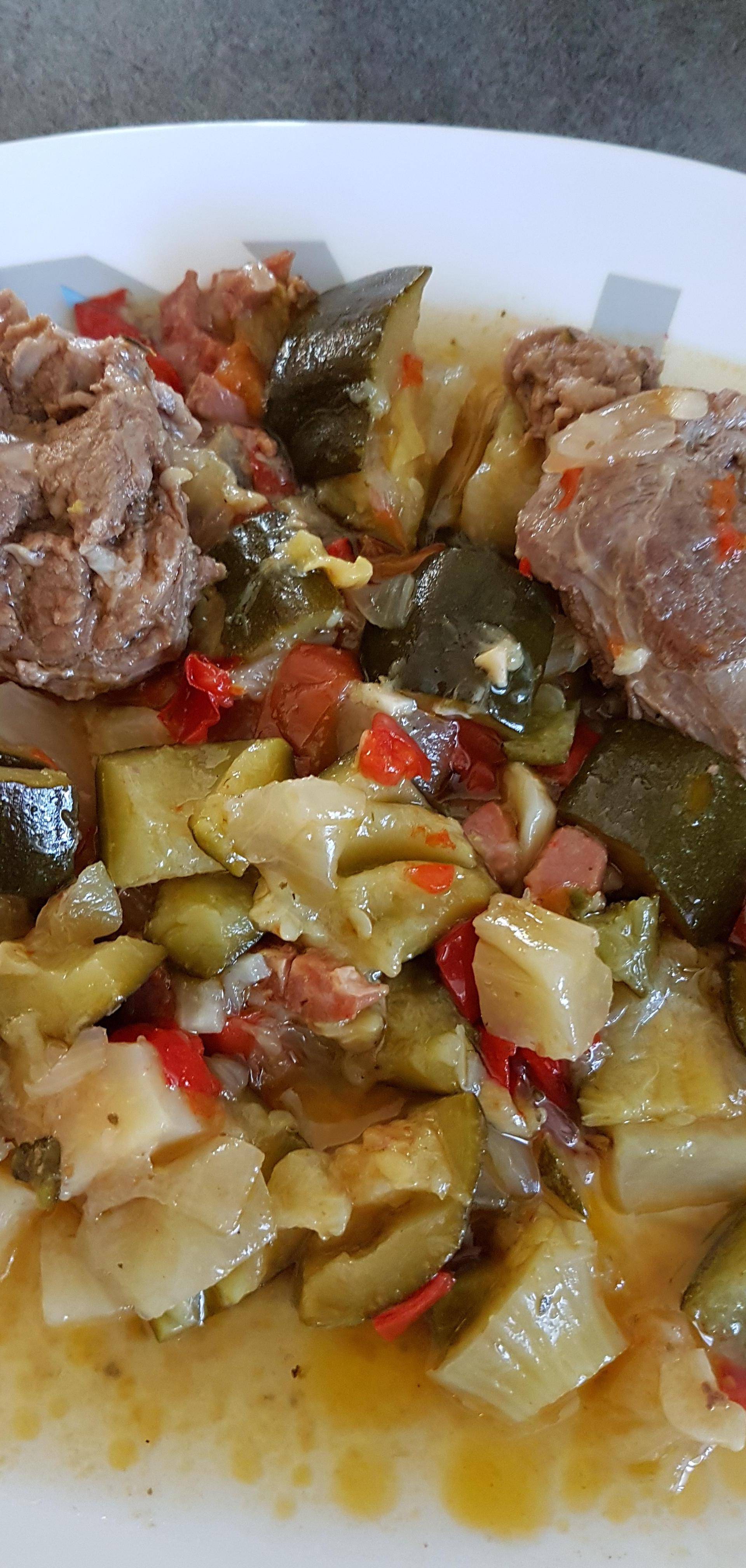 Mettre l'huile. Faire revenir la joue de porc puis ajouter les légumes, sel, poivre, épices sauf le vin, l eau et le fond de veau faire revenir le tout en mélangeant pendant 10 mn