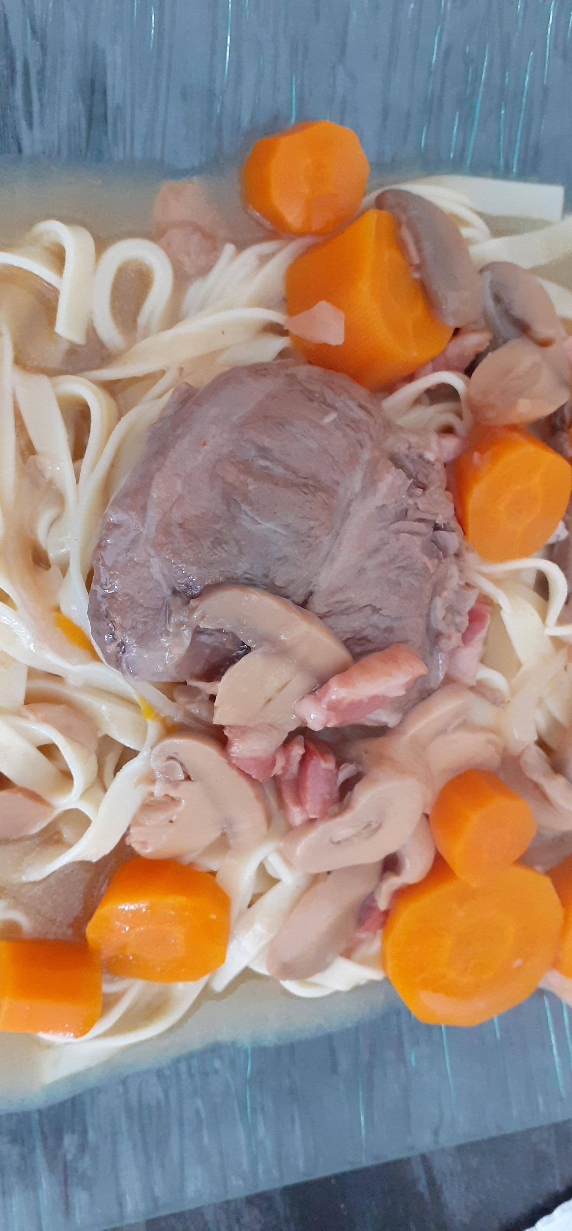 Ajouter le fond de veau, les carottes et les champignons et le cidre. Assaisonner avec le poivre