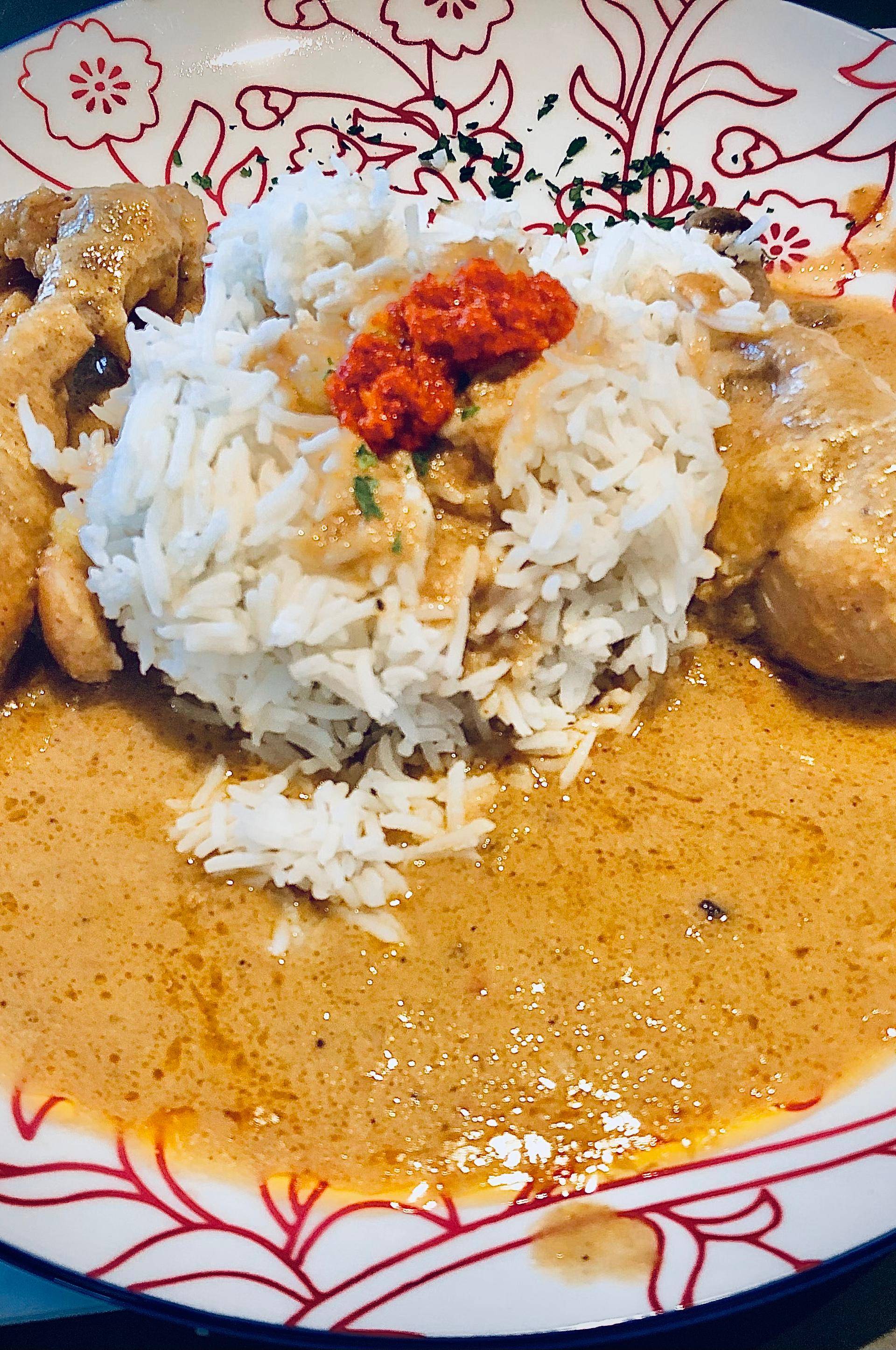 Écraser dans un moulinex: tomate + moitié d’oignons + gingembre + ails + noix de pépé concassé en avance + 10 cl d’eau