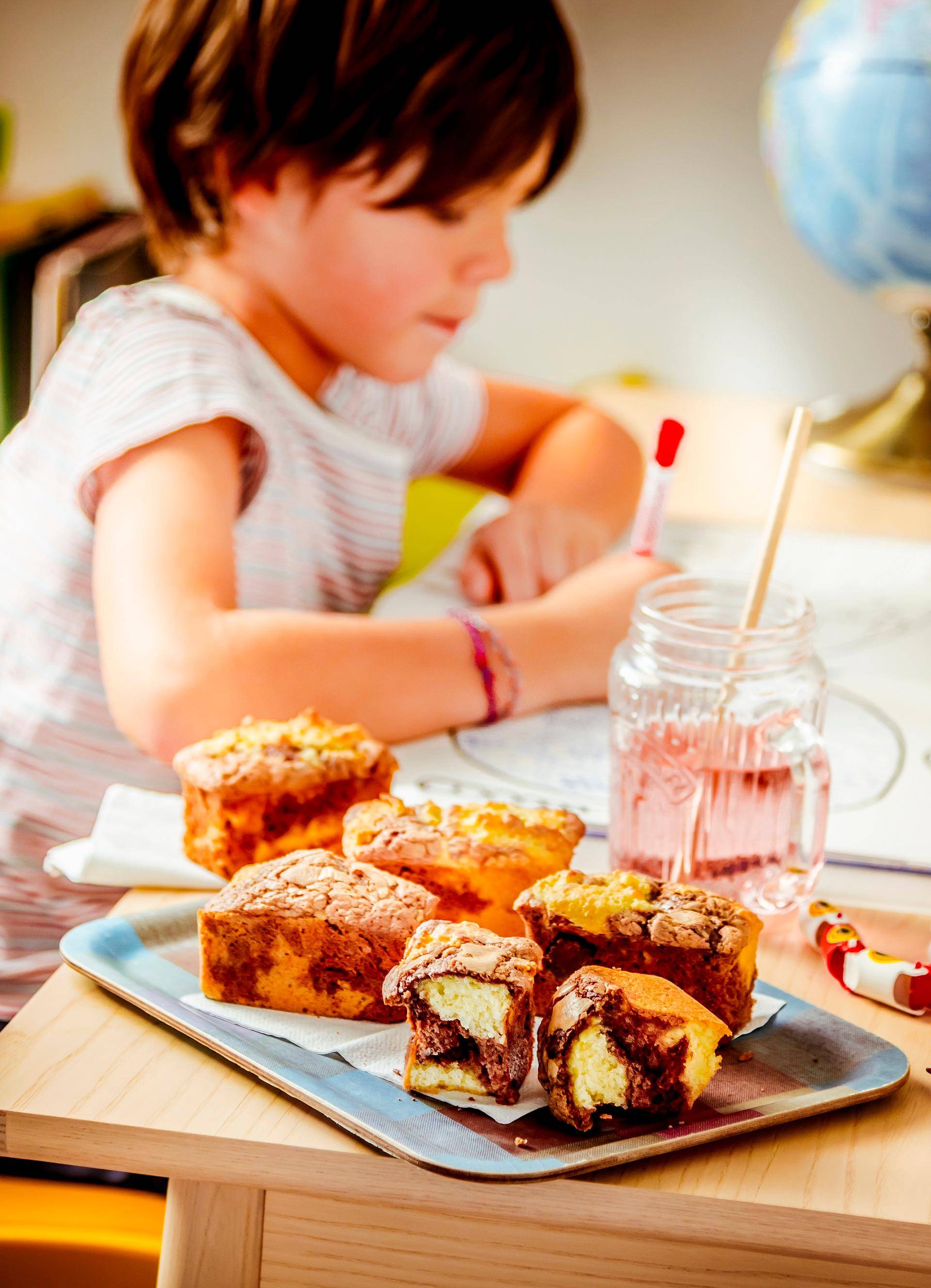 Beurrez des moules à mini-cake et répartissez les pâtes en alternant les deux couleurs dans chaque moule.