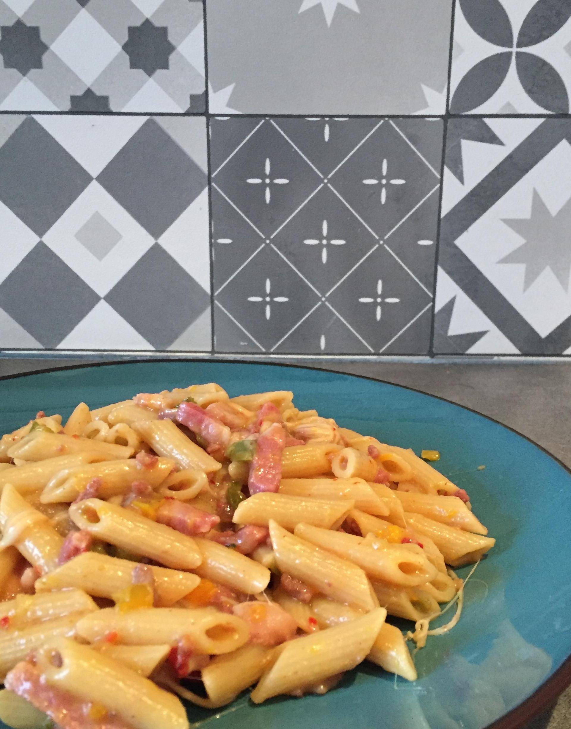 One pot pasta steak lardon poivrons Sauce barbecue