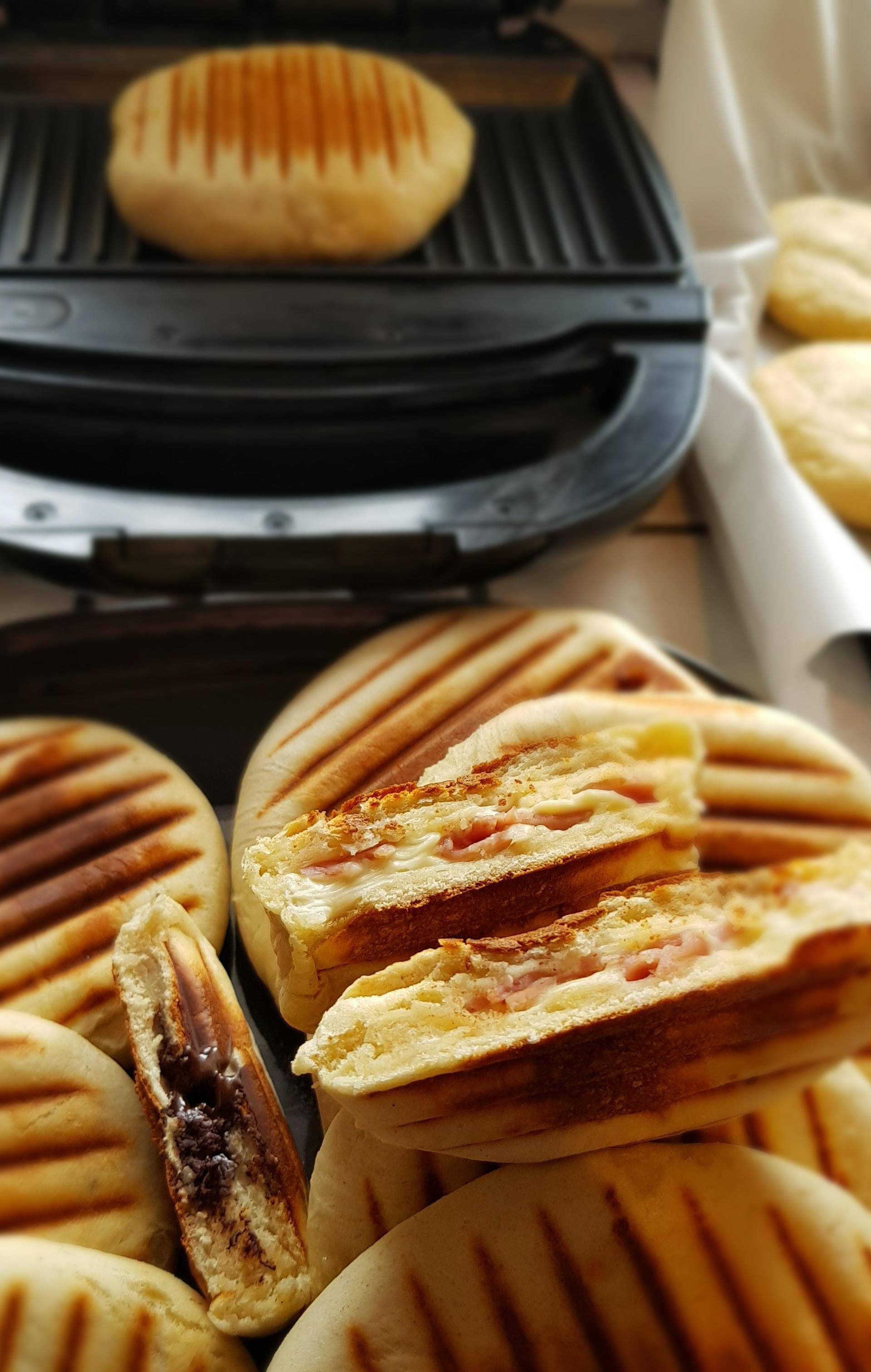 Bien applatir les boules, mettre la garniture, refermer comme un buns et applatir a nouveau. Attention a ne pas dechirer la pate. Les panini doivent etre bien plats ils vont gonfler. Laisser reposer 10 min