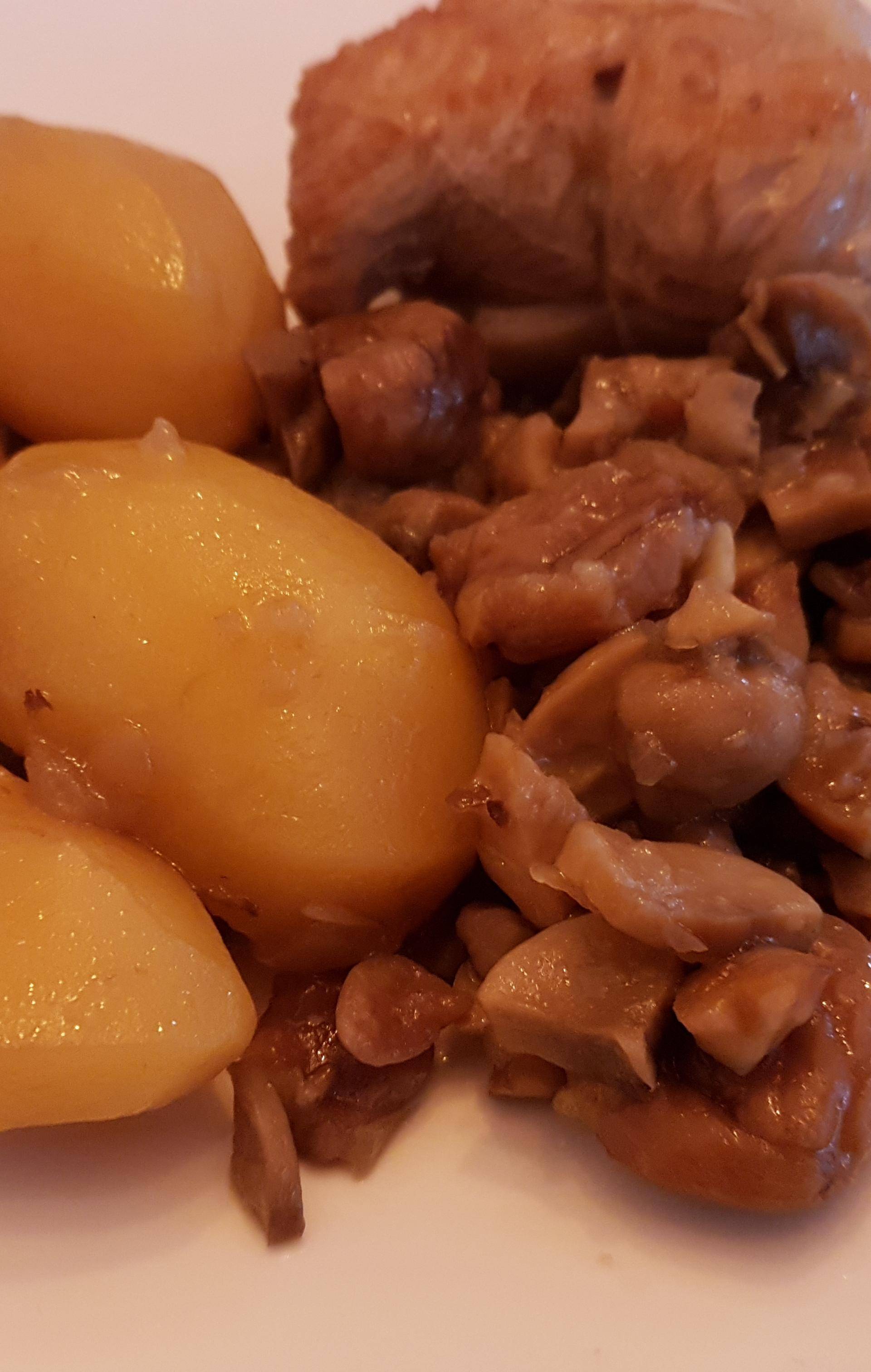Émincer oignons, couper grossièrement champignons, éplucher pomme de terre.