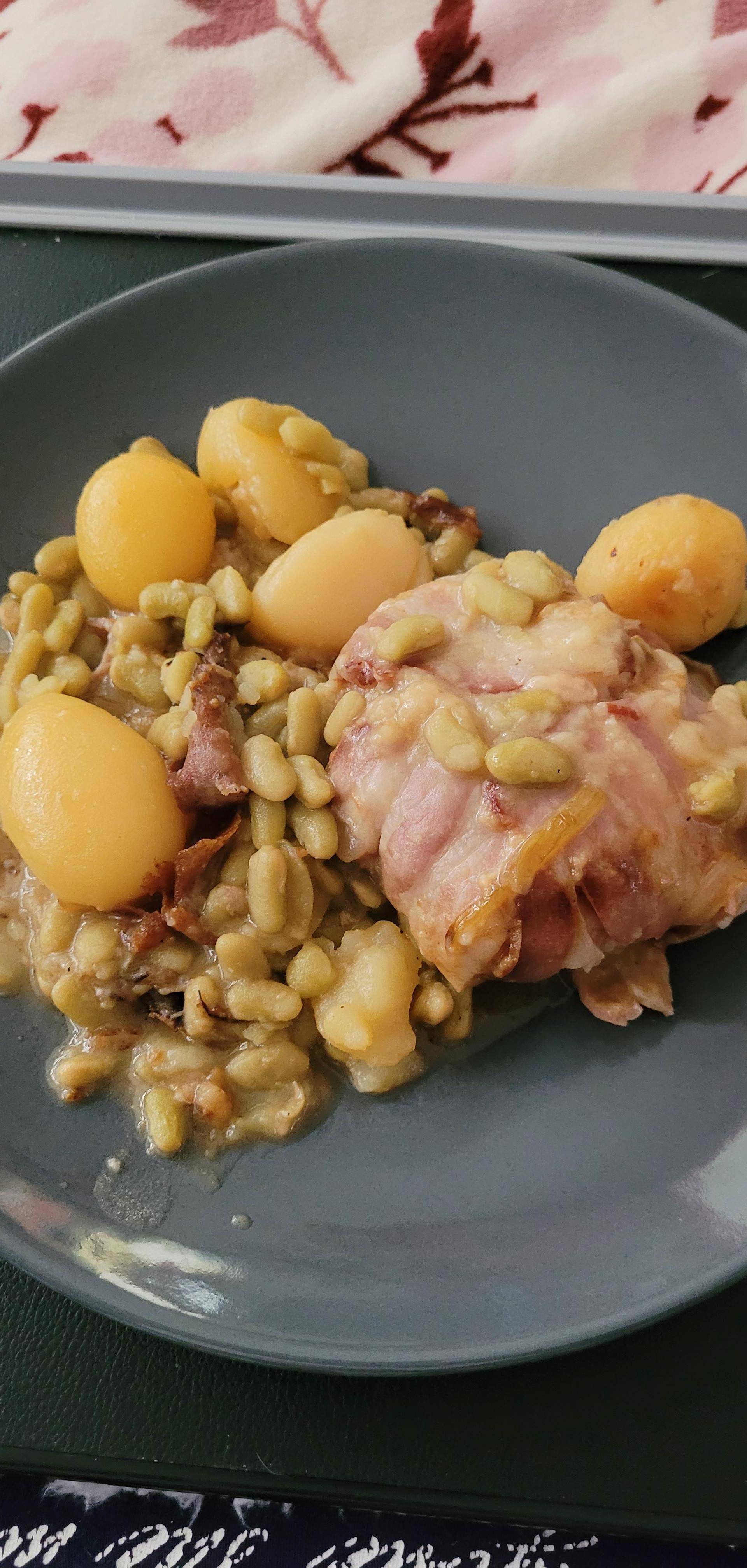 Pavé de porc aux pommes de terre et flageolets