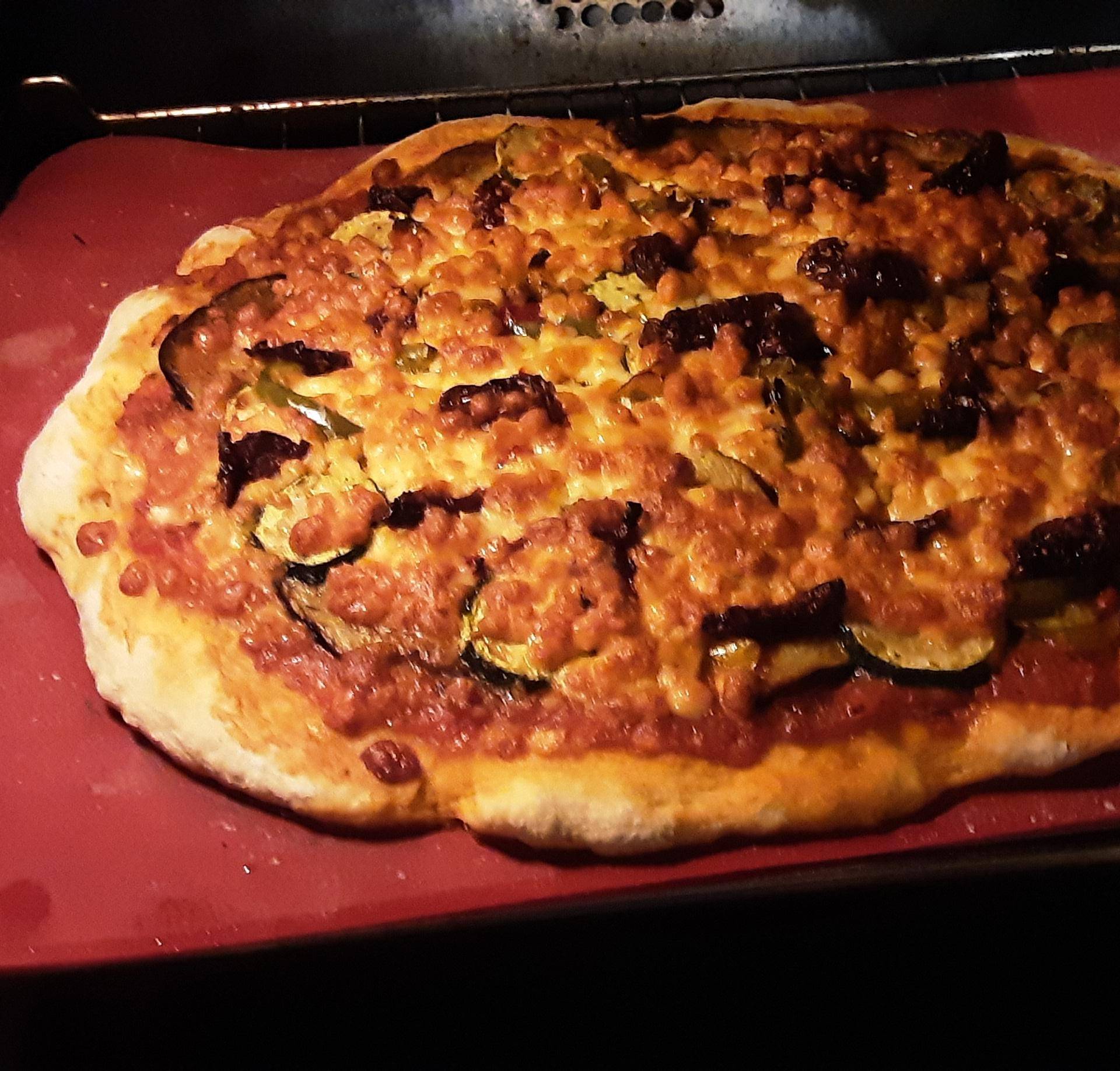 Préchauffer votre à four 220° Faire cuire les tranches d'aubergine à la poêle en plusieurs fois avec de l'huile d'olive environ 5 mn de chaque côté, quand elles sont cuites les étendres sur une feuille d'essui-tout pour les égoutter, cuire les tranches de courgette de la même façon. Puis dans la poêle faire sauter les poivrons. Rouler la pâte à pizza, l'installer sur une plaque à pâtisserie. Verser la boite de tomate et étendre à environ 2 cm du bord, Mettre une couche d'aubergines, une couche de courgettes, parsemer de poivrons, le fromage, salez, poivrez, piment d'espelette, saupoudrez d'herbes de Provence.