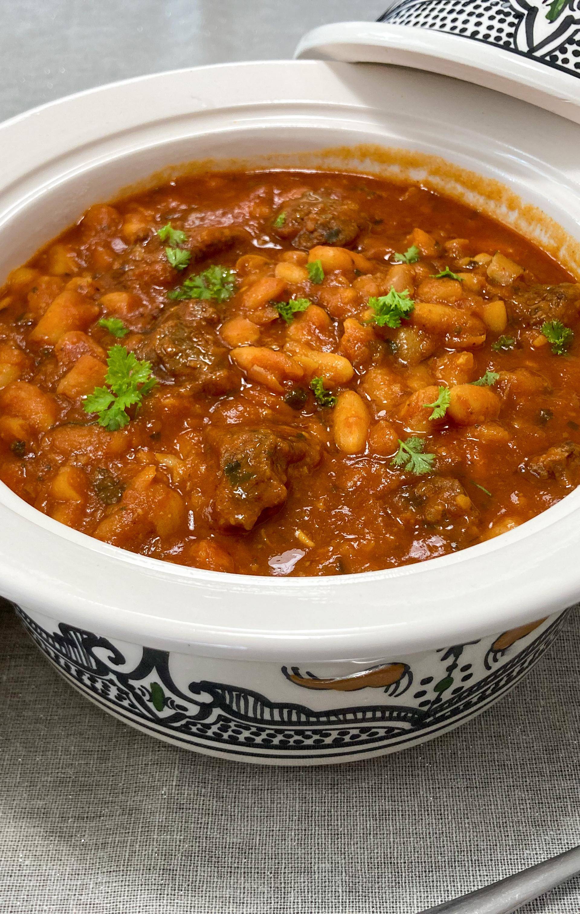 Mettre en doré et ajouter huile d'olive oignons et morceau de bœuf mixé la tomate et la mettre une fois que le boeuf et doré avec la sauce tomate et Larissa sel poivre le gingembre cumin feuille de laurier et de l'ail et les flageolet blanc cuire une à deux minutes en remuant ajouter deux verre d'eau chaude sa doit arriver un peut au niveau du bœuf
