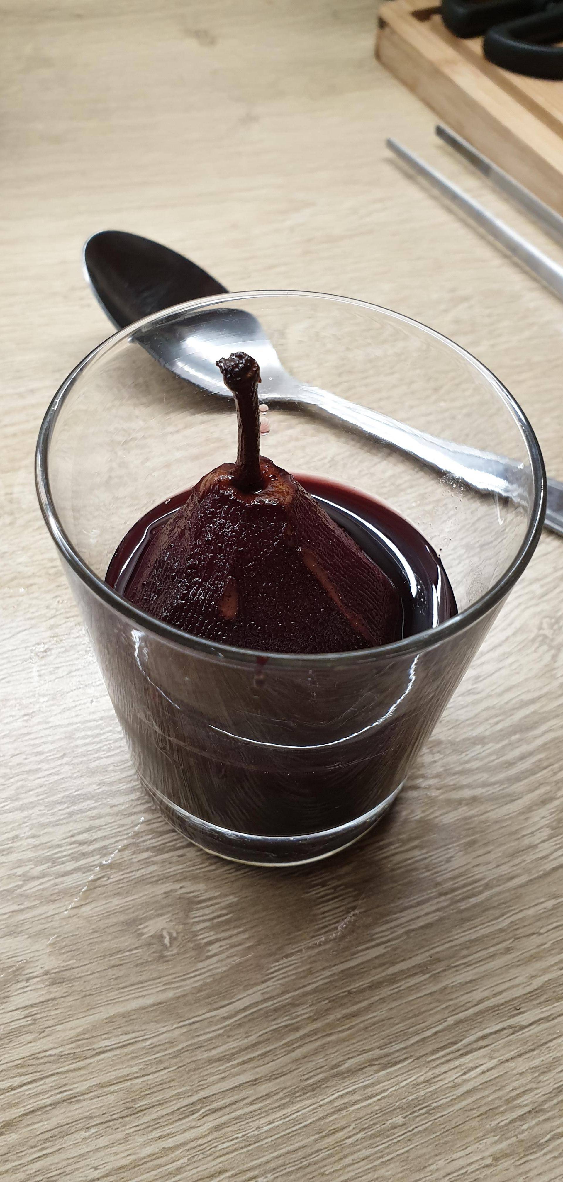 Verser dans un saladier les poires au vin et laisser reposer 1h avant dégustation