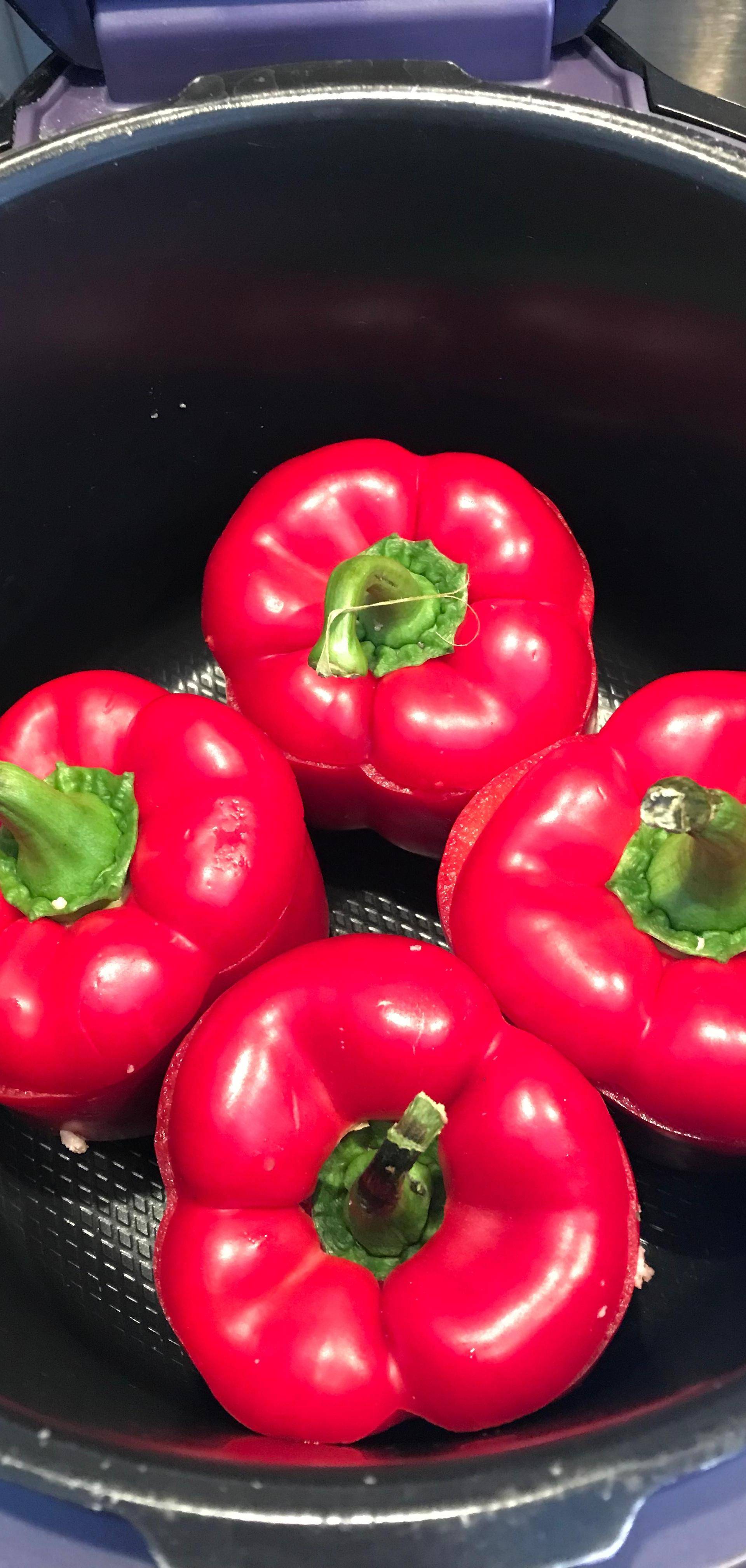 Remplir les poivrons avec la farce et disposer les poivrons dans la cuve (possibilité de mettre les poivrons dans le panier vapeur). Ajouter 20cl d’eau.