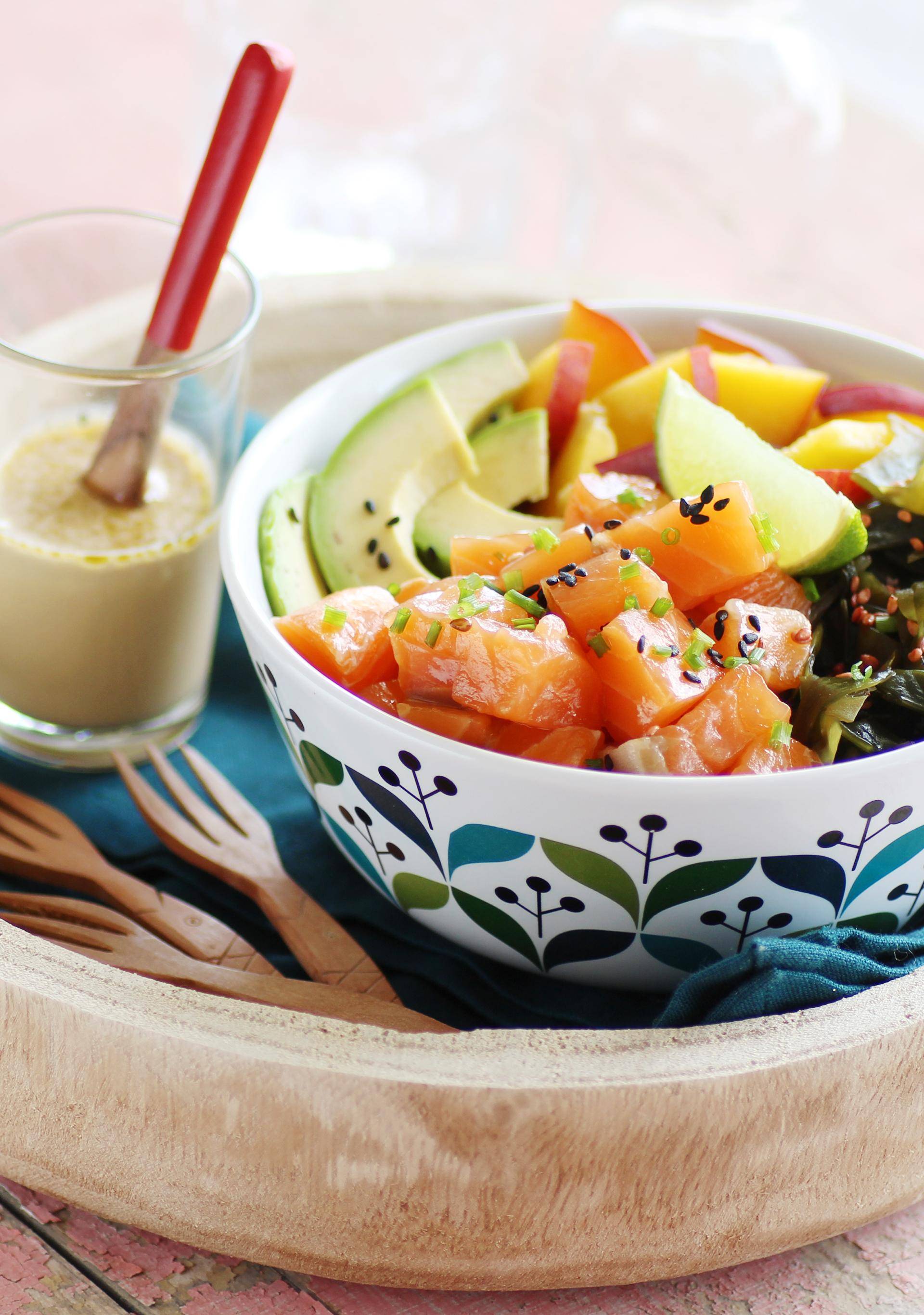 Garnissez avec le saumon, l'avocat, la nectarine, les graines de sésame et les algues.