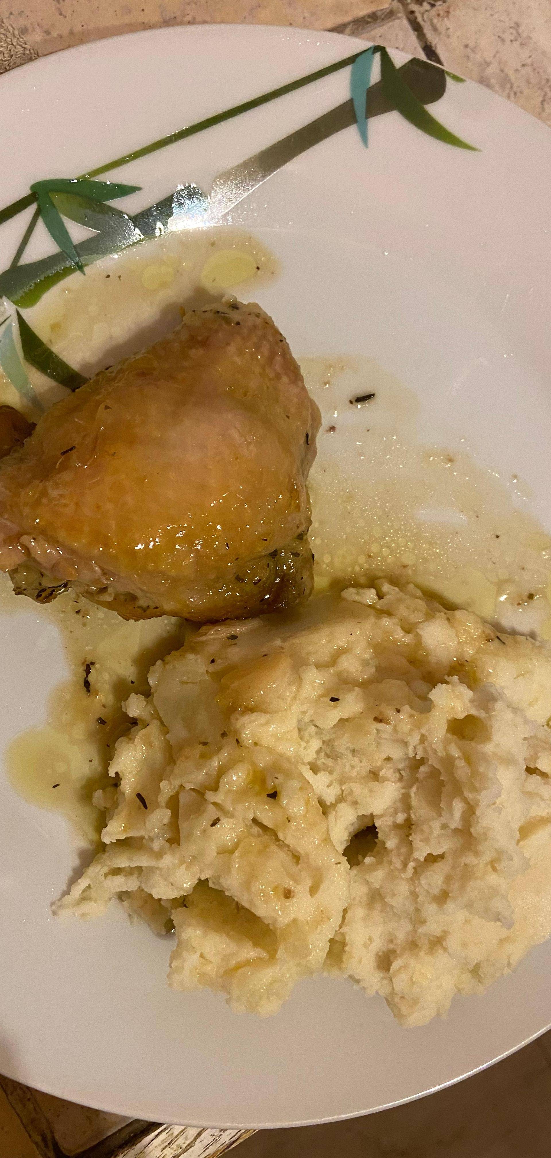 Commencez par préparer tout les ingrédients : 14 gousses d’ails (en hacher 6 sur les 14 et laisser les 8 autres entières) 50g d’huile d’olive 1kg de cuisse de poulet ou de haut de cuisse de poulet Une pincée de sel 1 cuillère à café d’origan 150ml de vin blanc 100ml d’eau Un bouillon de volaille