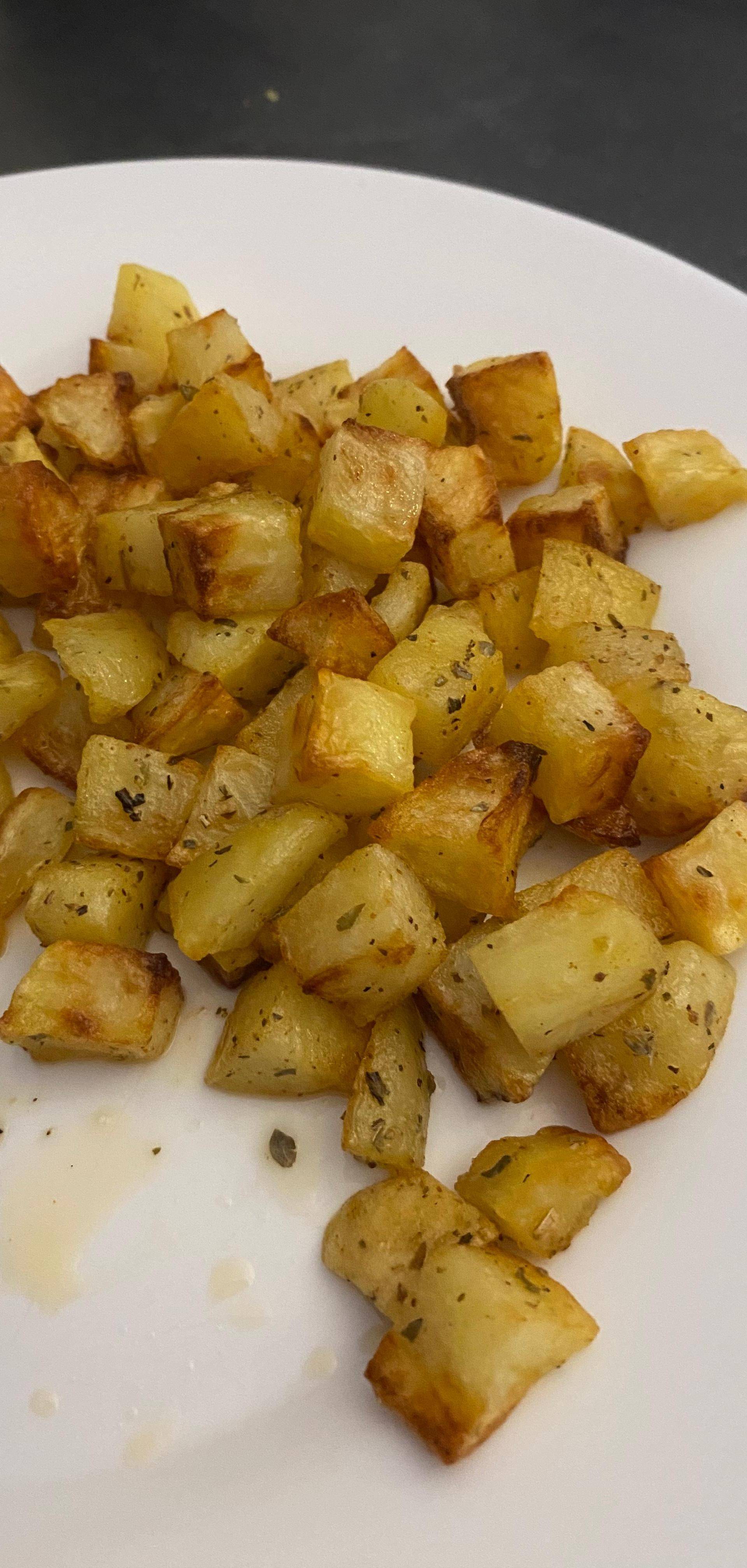 Éplucher les pommes de terre, les couper en cube, les rincer à l’eau et les sécher.