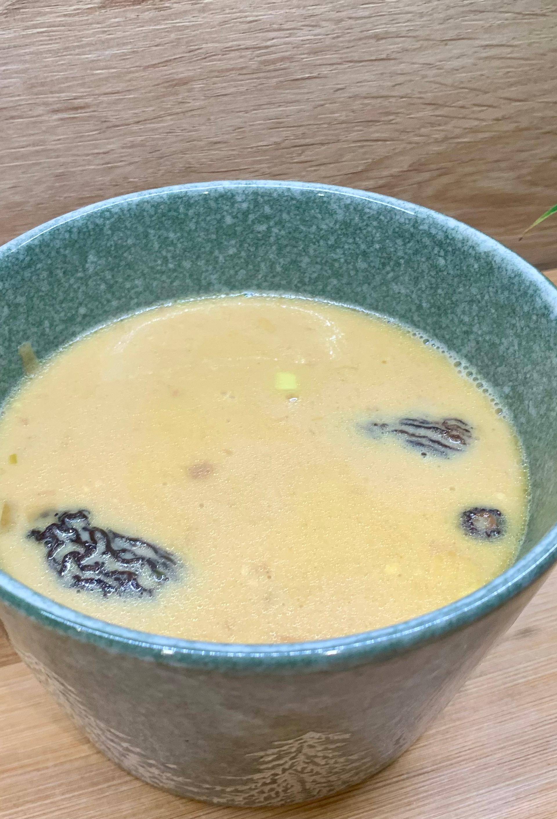 Récupérer l’eau des morilles en versant le tout dans une passoire avec un bol en dessous, et une feuille de sopalin ou une gaze dans la passoire, en versant doucement de manière à éviter de verser le sable se trouvant au fond du bol. Bien réserver ce jus qui servira pour le potage.