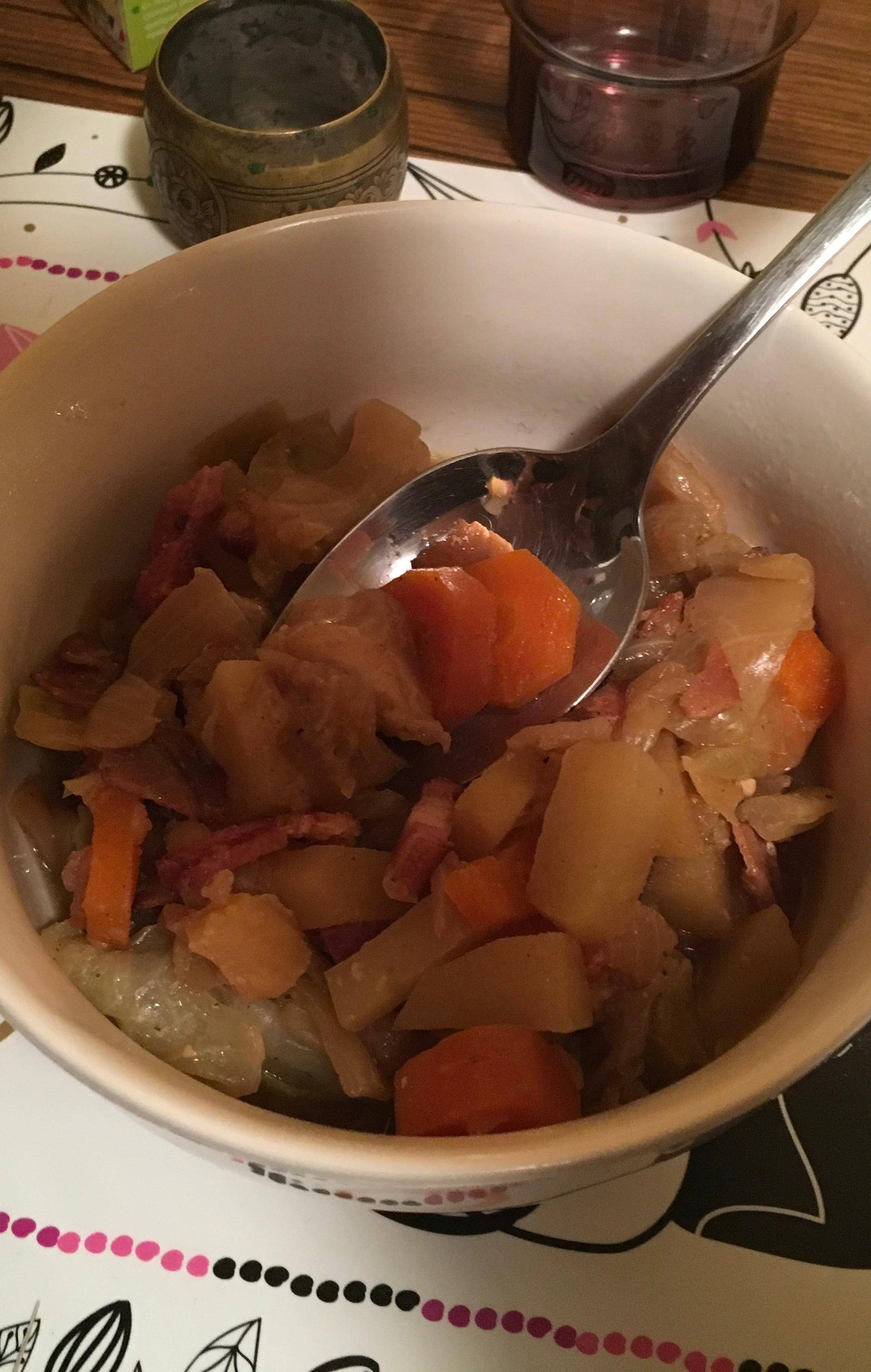 Deguster soit dans un bol, comme un potage, soit en accompagnement. La recette peut varier selon les goûts et les saisons (haricots blancs, saucisses végétales, poireaux, champignons...)