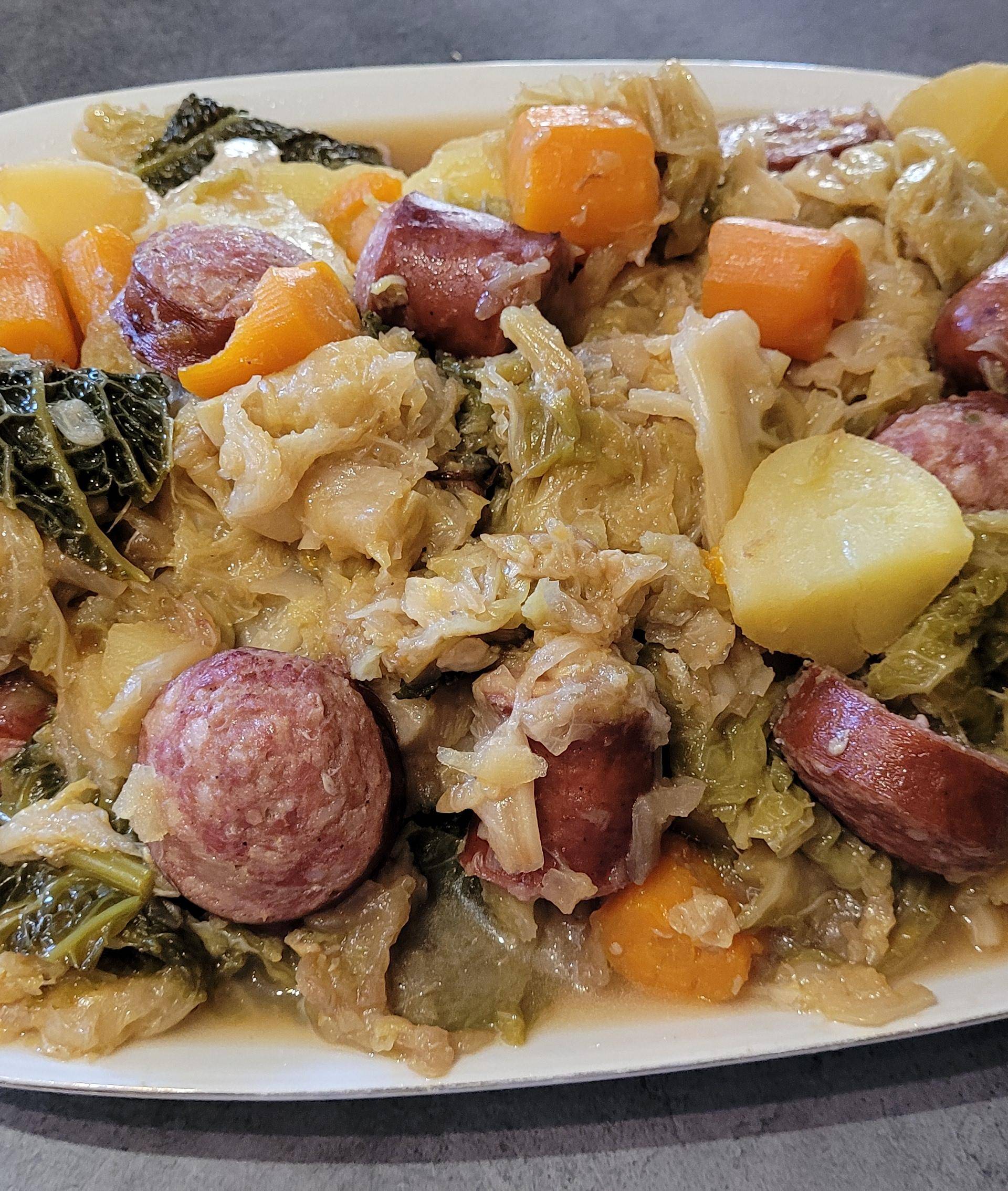 Émincer les oignons, couper les carottes en tronçons épais, couper les saucisses de Montbéliard en 4 et la saucisse de morteau en rondelles épaisses.
