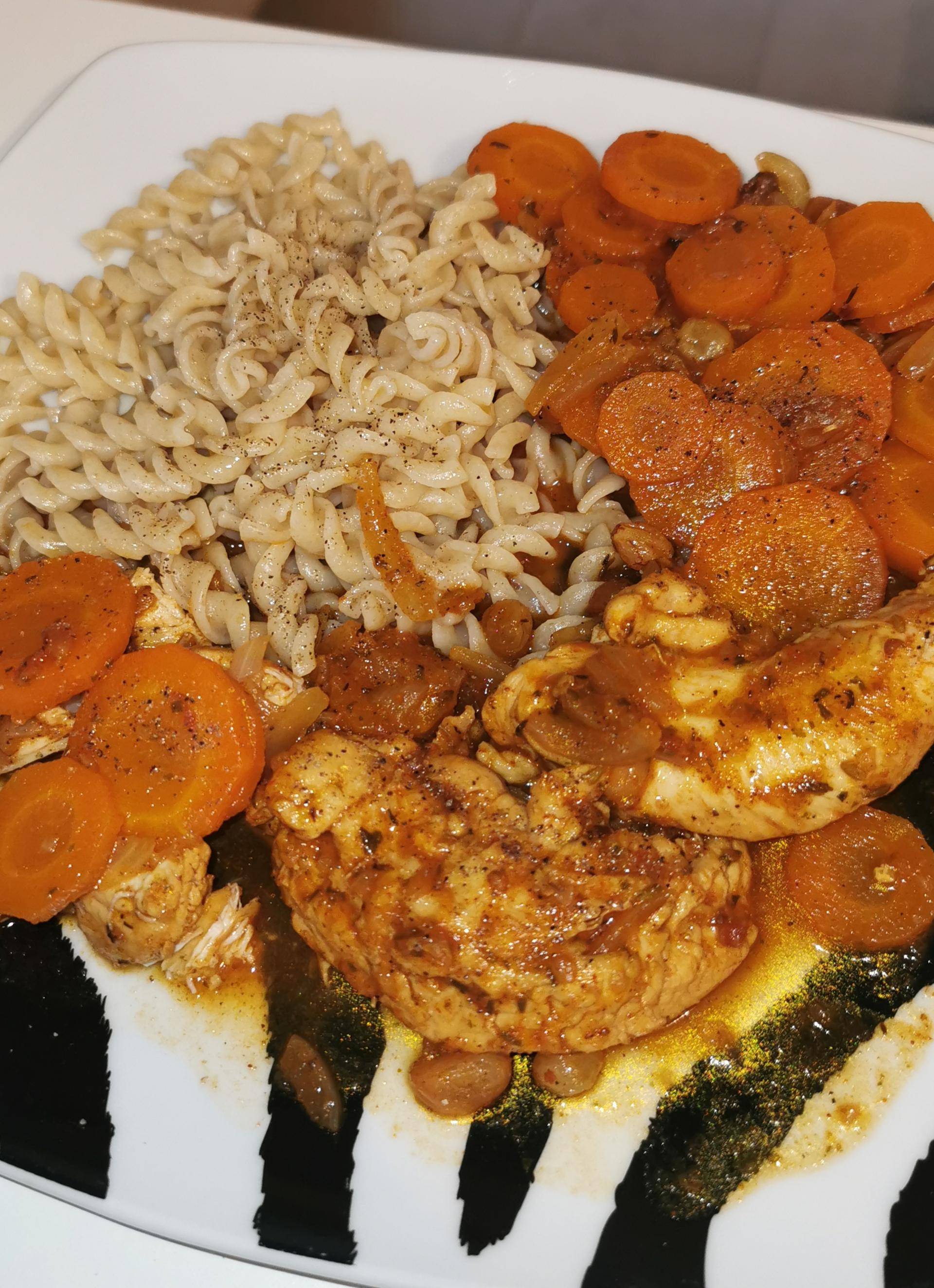 Ajouter le fond de veau mélangé au concentré de tomate, le reste des épices à tajine et les raisins secs. Sel, poivre. Mettre sous pression 12 minutes.