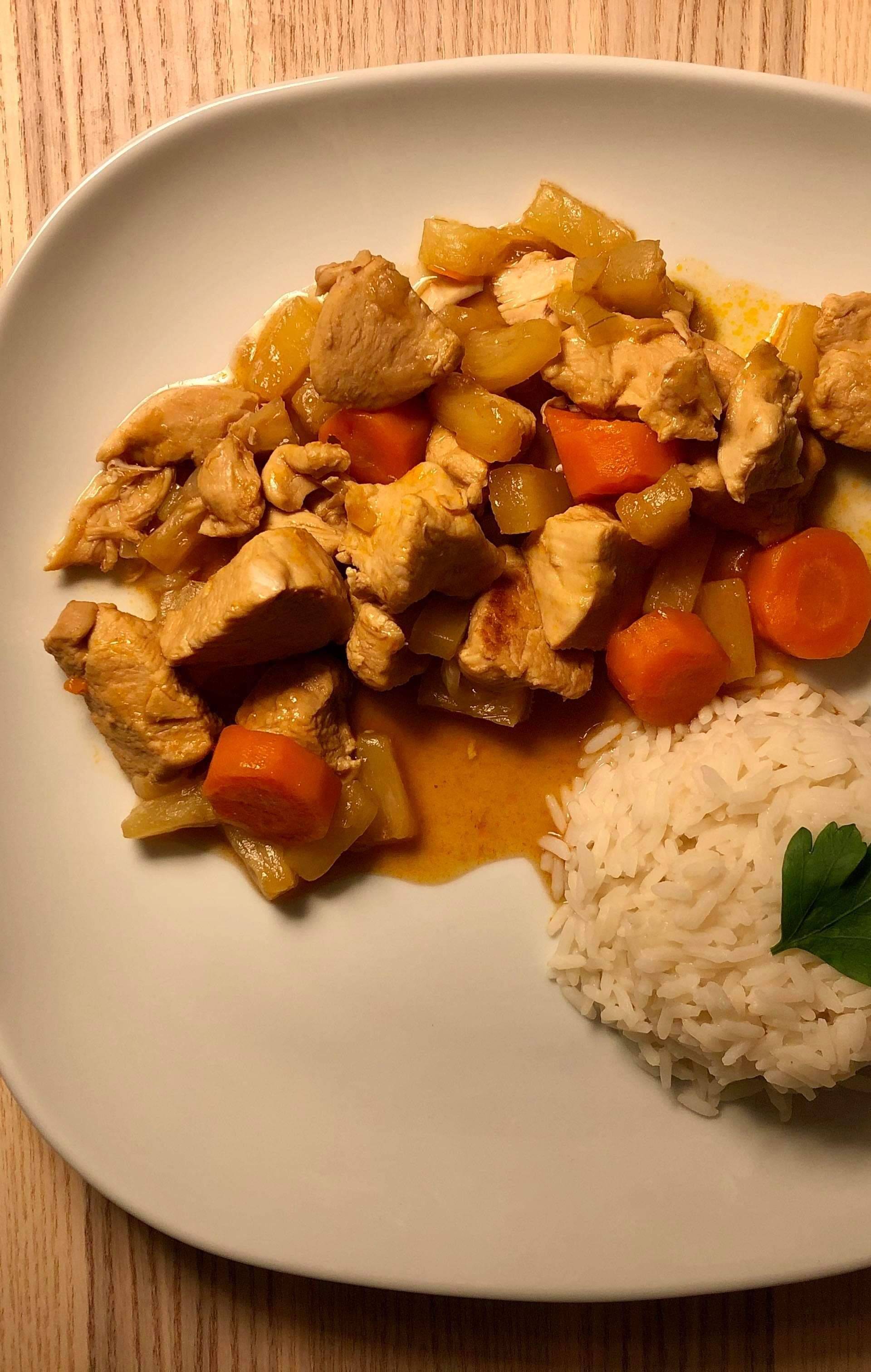 Faire dorer les oignons avec les carottes et l'ananas et le poulet dans un peu d'huile.