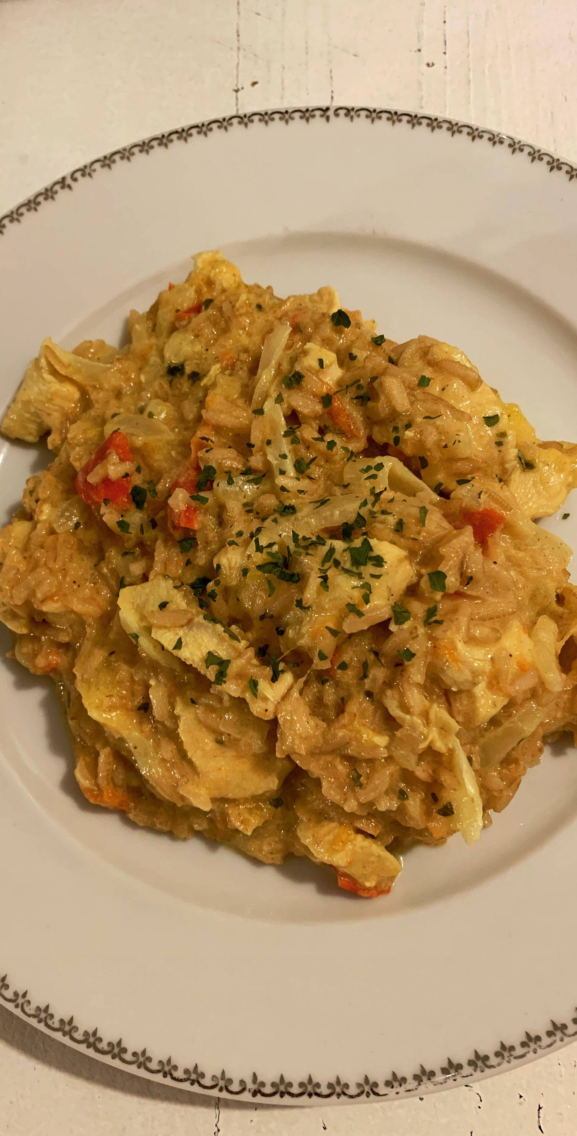 Lorsque le tout est bien doré, ajouter le lait de coco, le riz puis l'eau. Mélanger et mettre à cuire sous pression pour 11 minutes. Pour ma part j'ai rajouté un peu de curry avec le lait de coco