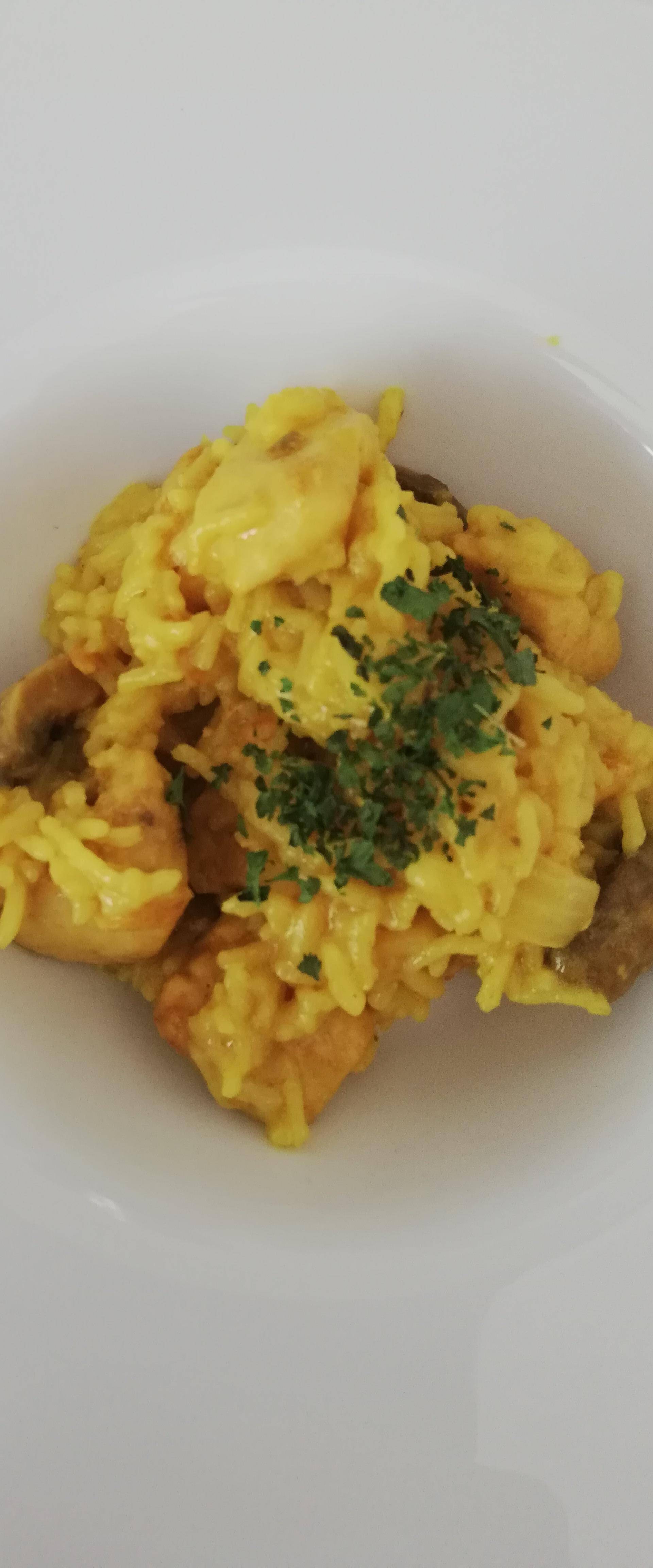 Mettez à dorer les oignons dans un peu d'huile d'olive, ajouter le poulet et les champignons