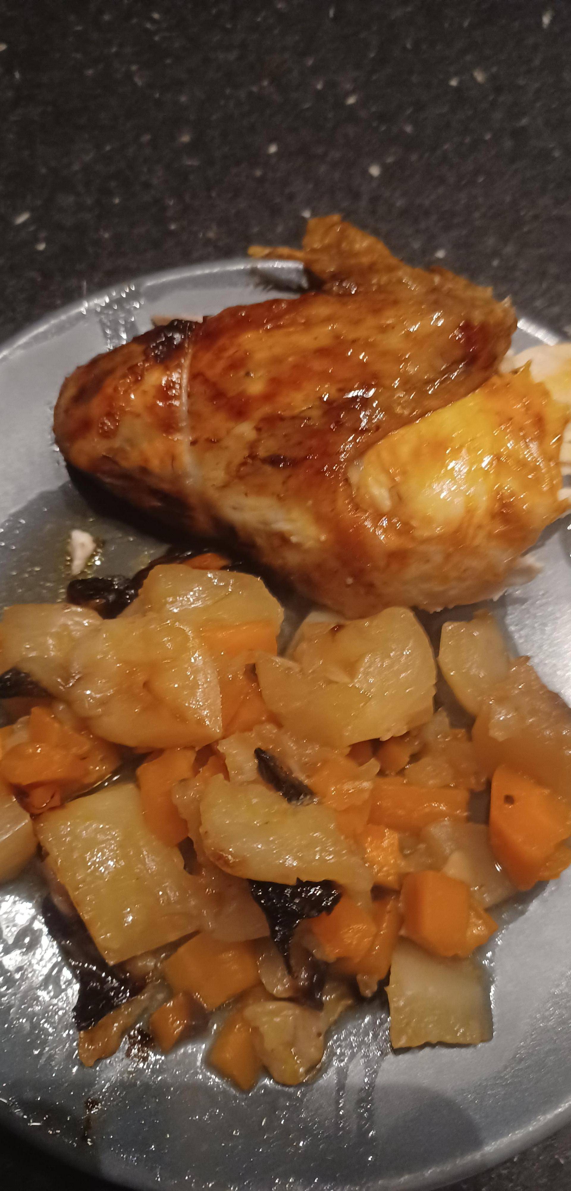 Lorsque les légumes sont cuits, ajoutez le poulet, salez et poivrez et installez l'extra crisp, utilisez le menu 1, et ajoutez le temps nécessaire selon la taille de votre poulet, bien le retourner à mi cuisson., en moyenne 45 mn