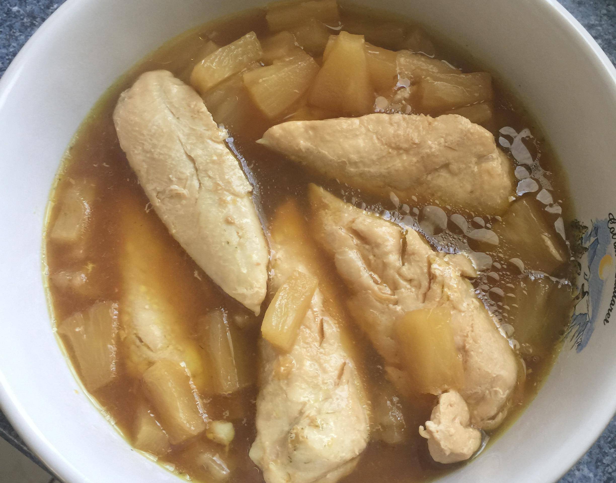 Versez les 200 ml du jus d'ananas et les 200 ml d'eau. Fermez le couvercle et mettre sur la fonction cuisson sous pression pendant 35 minutes.