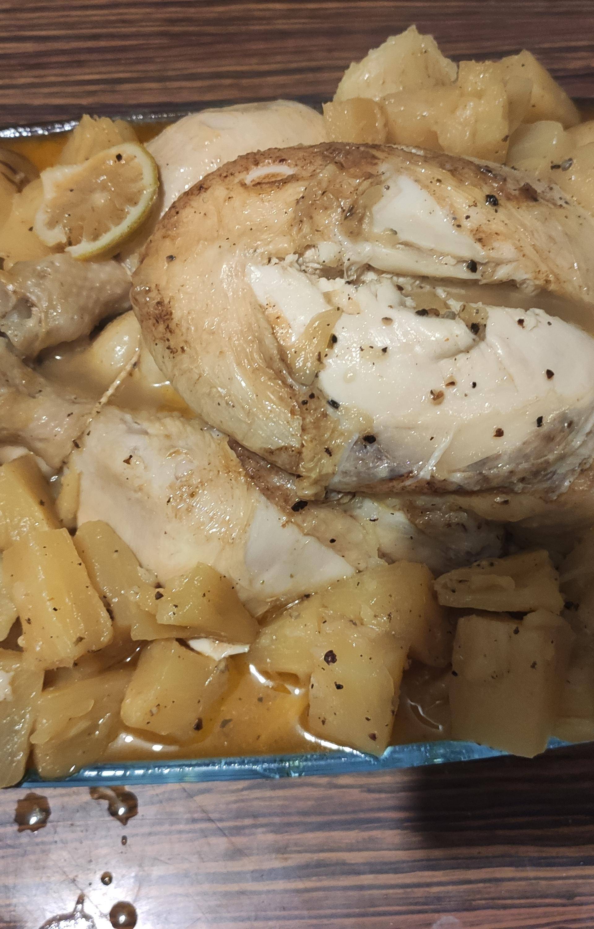 Mettre les pommes de terre autour du poulet. Salez poivrez et saupoudrez d'épices.