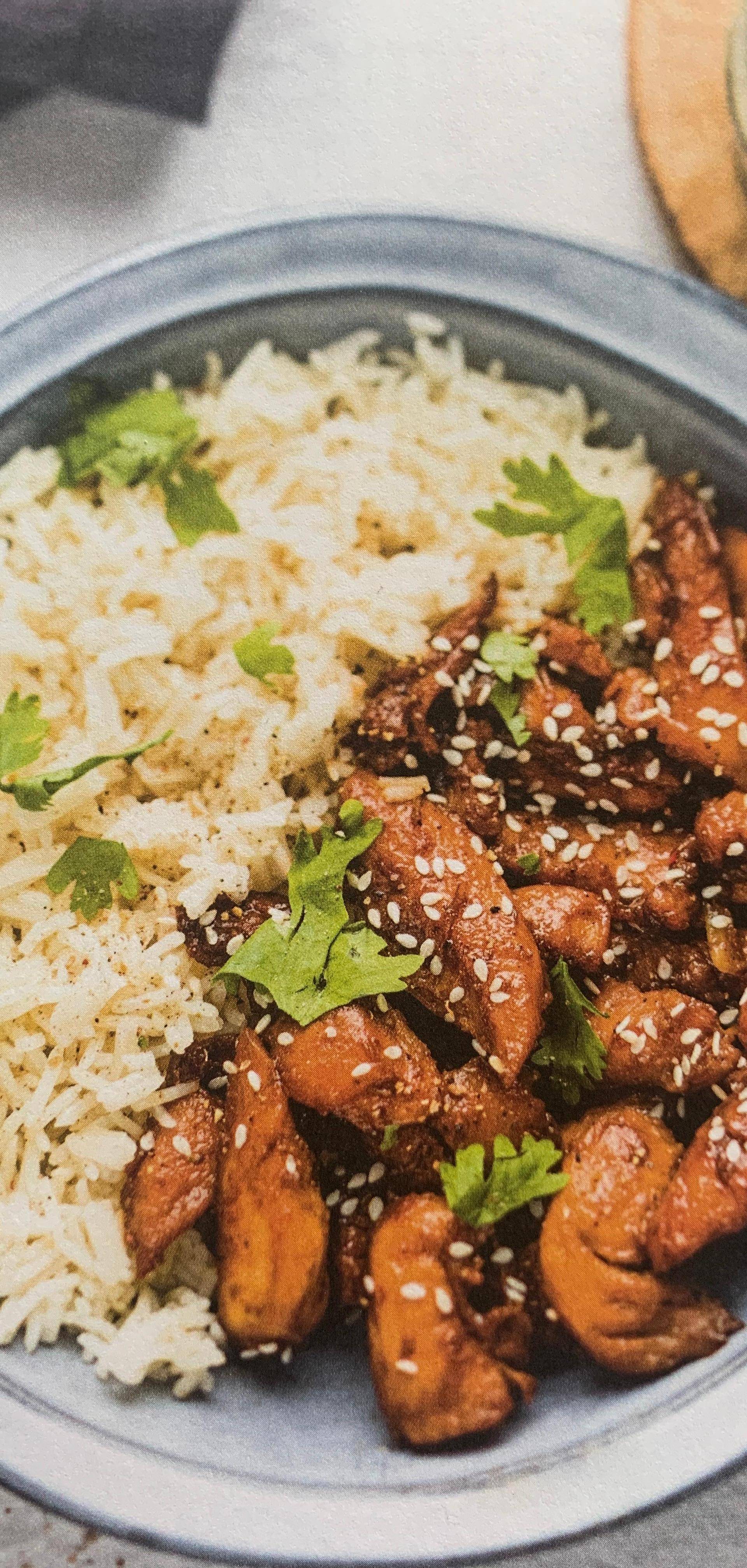Lavez la cuve, versez l’huile de sésame, le poulet et sa marinade. Faire rissolage fort pendant 8 mn en remuant très régulièrement. Servez avec le riz, parsemez de coriandre et de la cuillère à soupe de graines de sésame.