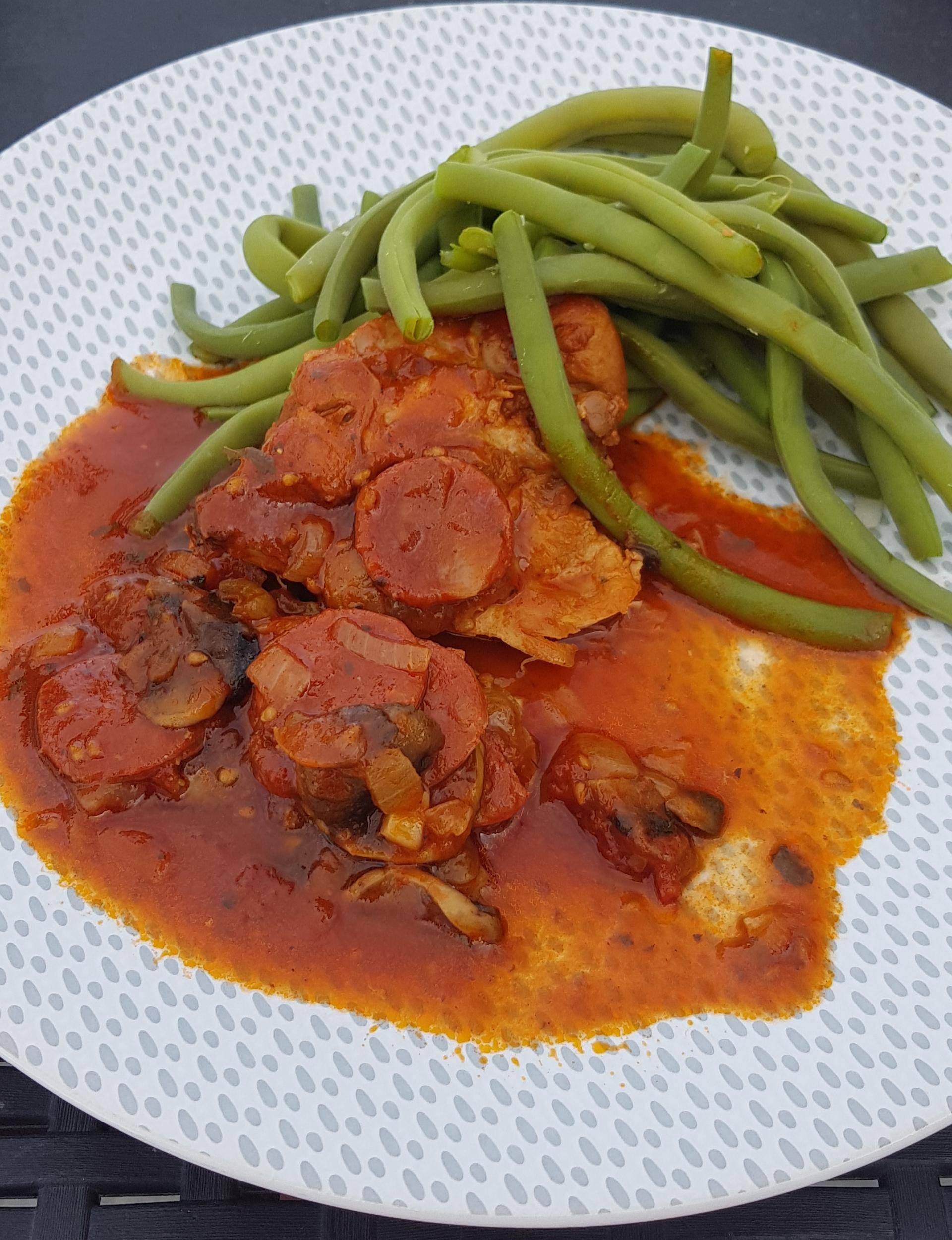 Ajouter les champignons et le chorizo coupés en tranches. Mélanger.