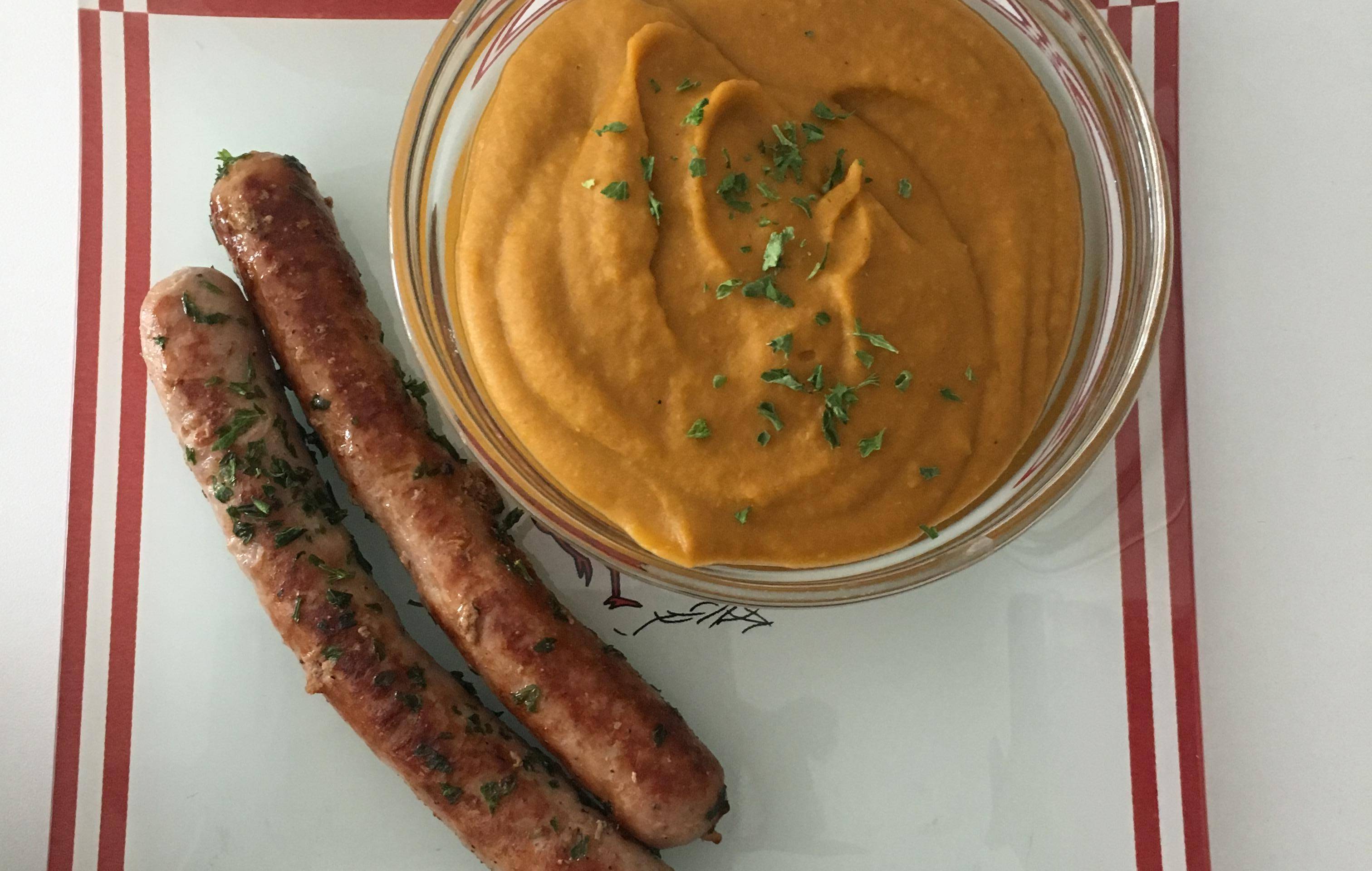 Une fois les pois cassés cuits, ajouter 1 c.a.s d'huile d'olive dans la cuve et mélangez. Salez, poivrez. Déposez les chipolatas et les brisures de pain grillé sur les purées. Fin