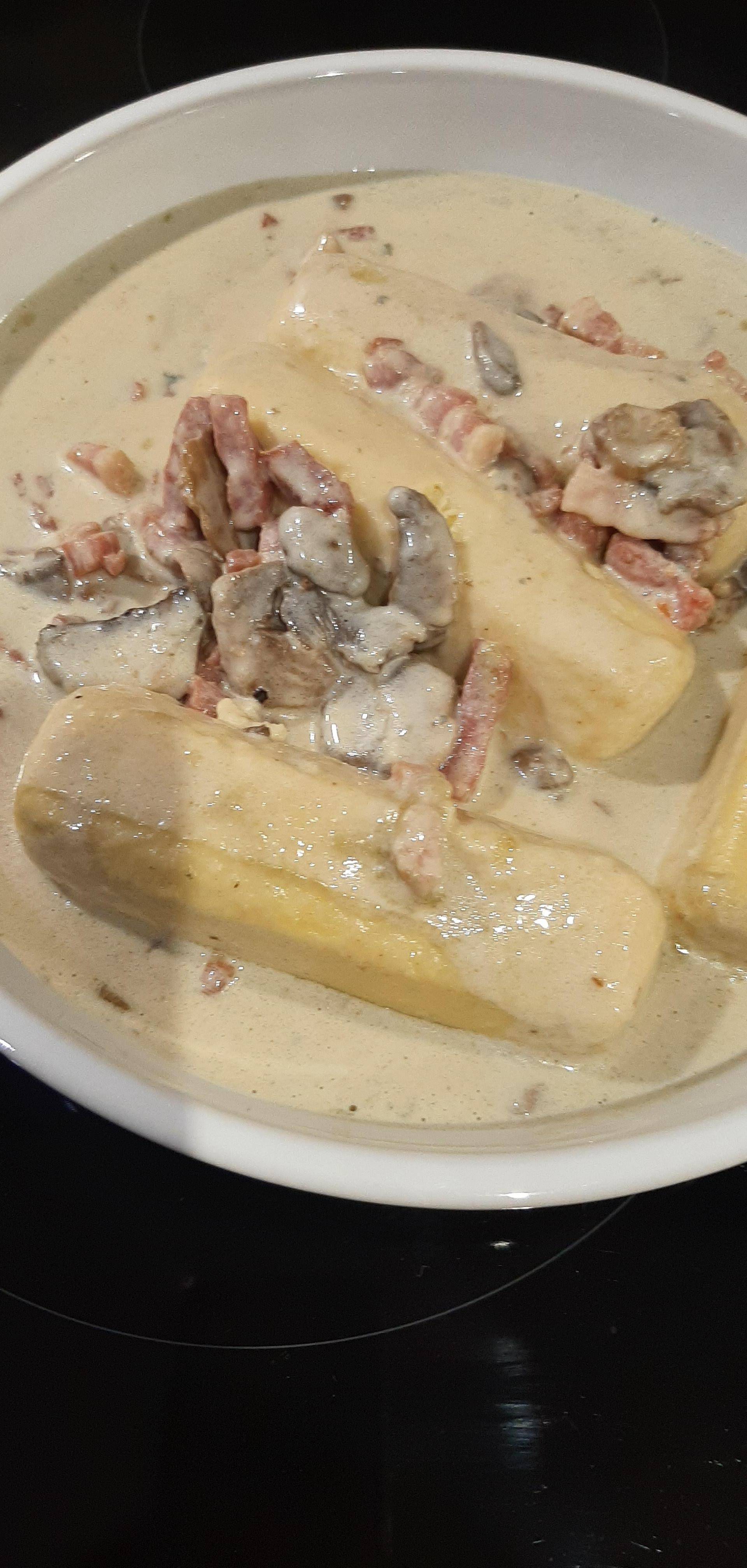 En mode dorer faire revenir les lardons dans l'huile d'olive et ajouter les champignons émincés laisser 2mn en remuant