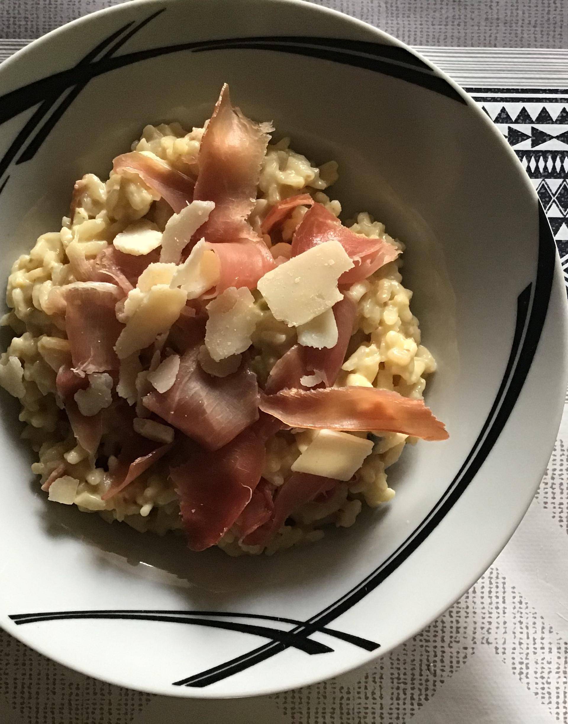 Ajouter la crème fraîche et le parmesan et mélanger le tout. Servir en émiettant du jambon cru au dessus du risotto et parsemer le risotto de copeaux de parmesan si vous en avez.
