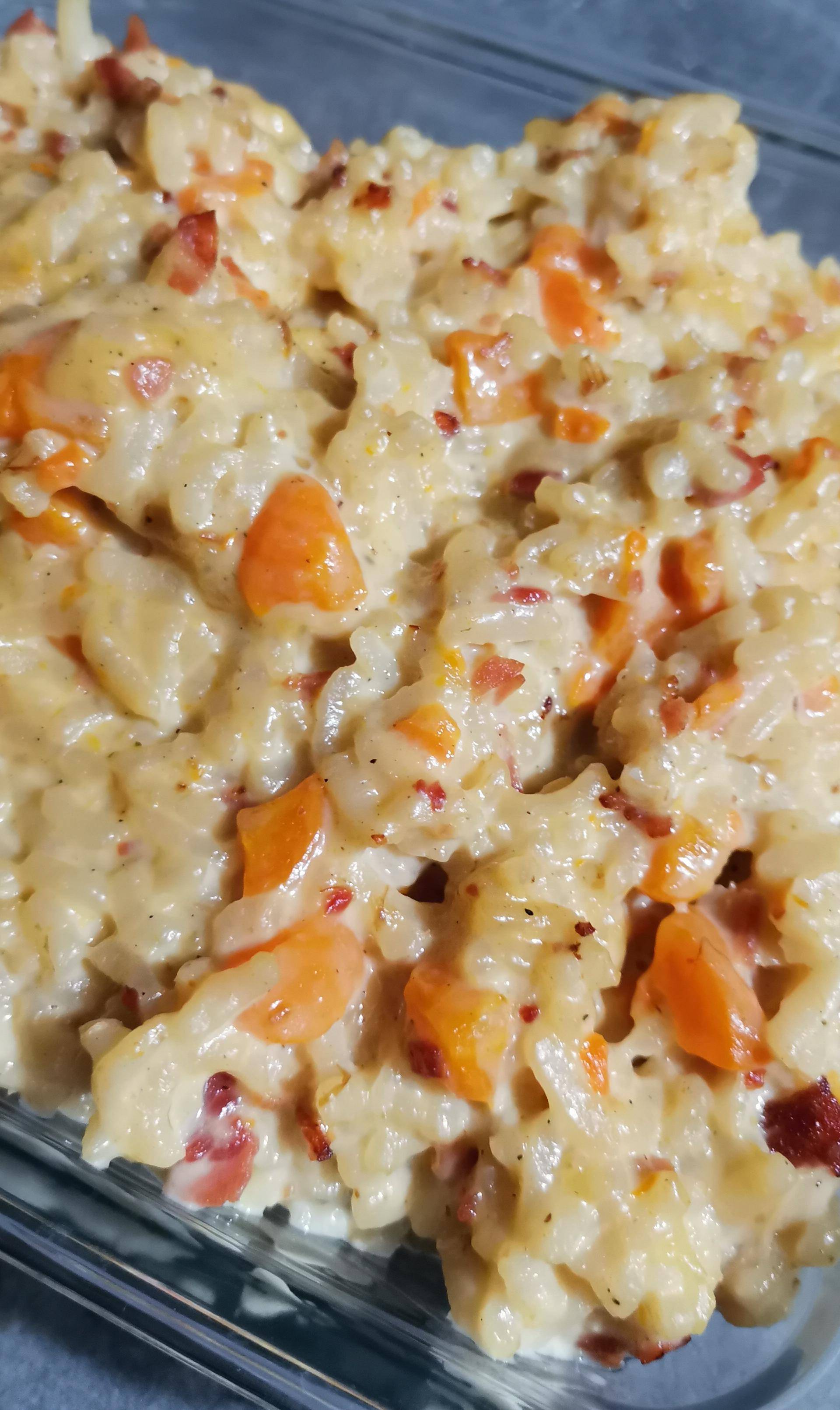 Faire cuire l'oignon jusqu'à ce qu'il devienne translucide, puis ajouter les carottes et le jambon. Faire dorer 3min