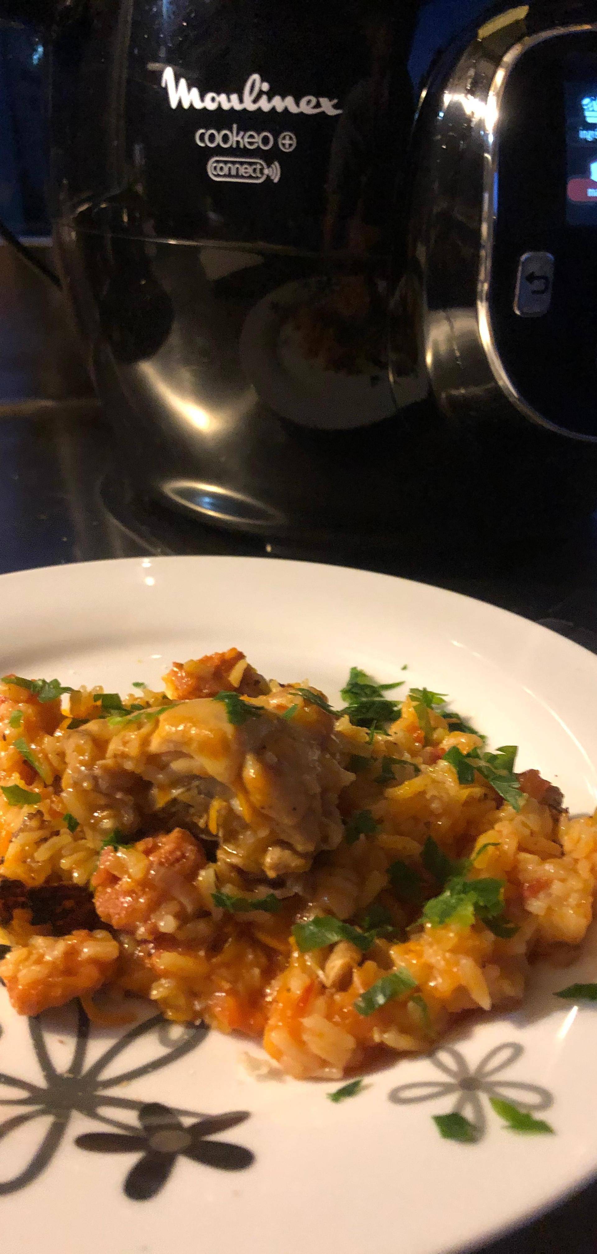 Une foi les oignons translucide arrêtez le mode dorage et ajoutez le chorizo les carottes la sauce tomate remuez l’ensemble , vous pouvez maintenant ajouter le riz et remuez bien l’ensemble , ajoutez les bouillons de poule préalablement dilués dans les 3 verres d’eau. Et toujours remuez bien l’ensemble.