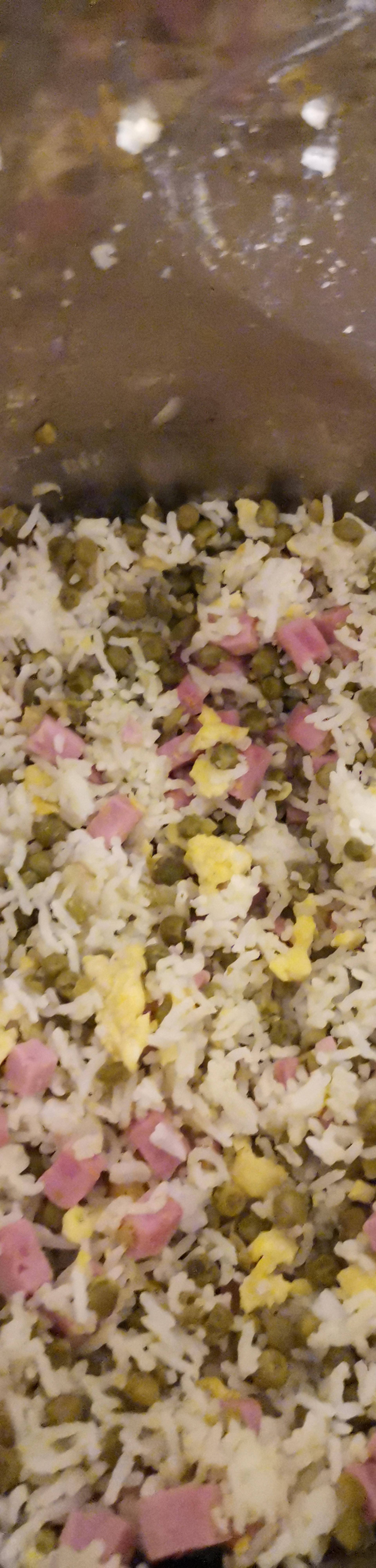 Mélanger le riz l'œuf brouller les oignons des jambon petits pois ensemble et server bon appétit