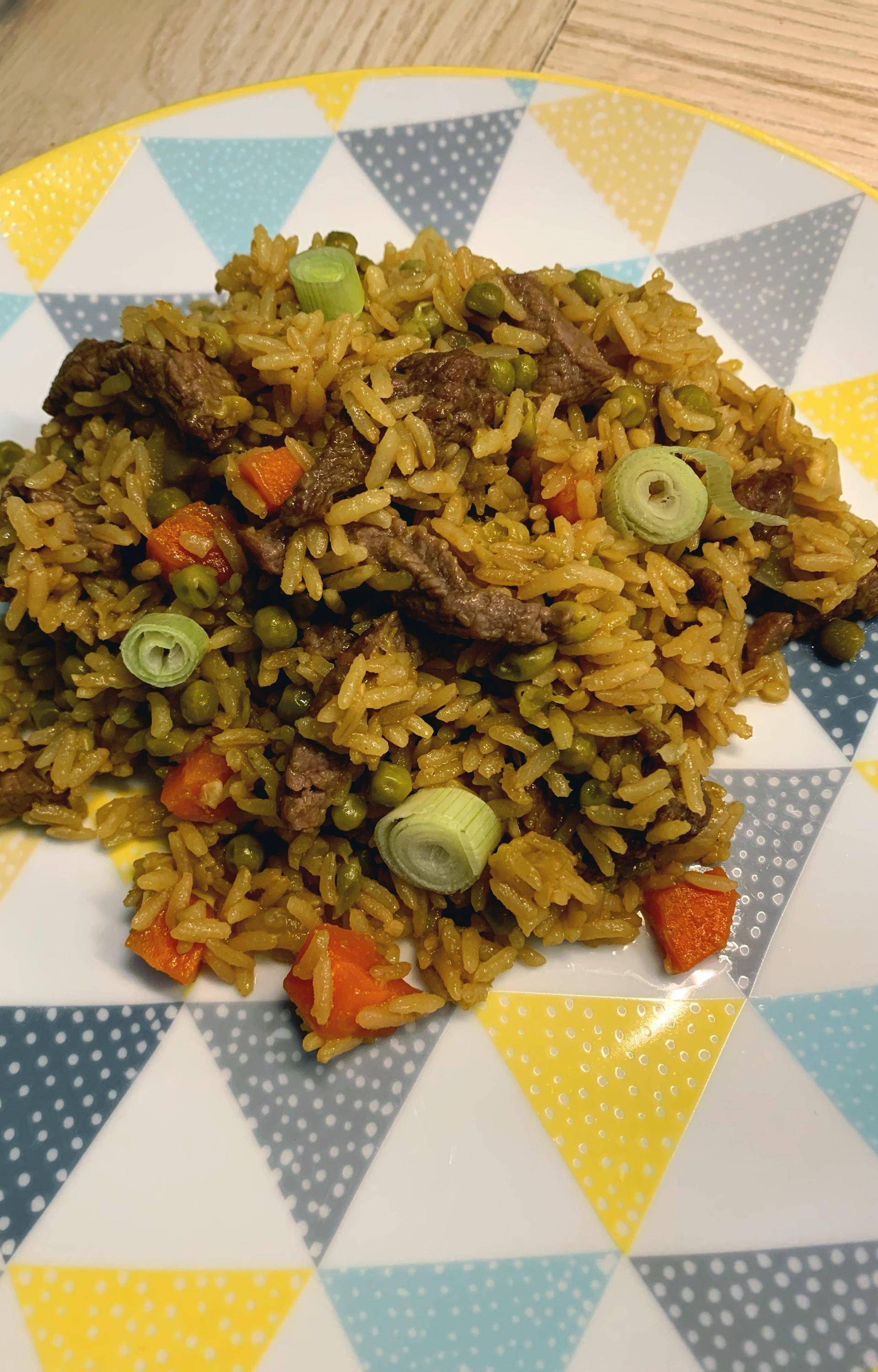 Ajoutez l’oignon émincé et faites le revenir avec de l’ail pilé. Une fois les oignons transparents , on ajoute les carottes , petits pois , le riz et de l’eau ( pour 1 verre de riz je met 1 verre et demi d’eau ) , sel poivre , épices , sauce sucrée , mirin . Remettre la viande et bien mélangez le tout .
