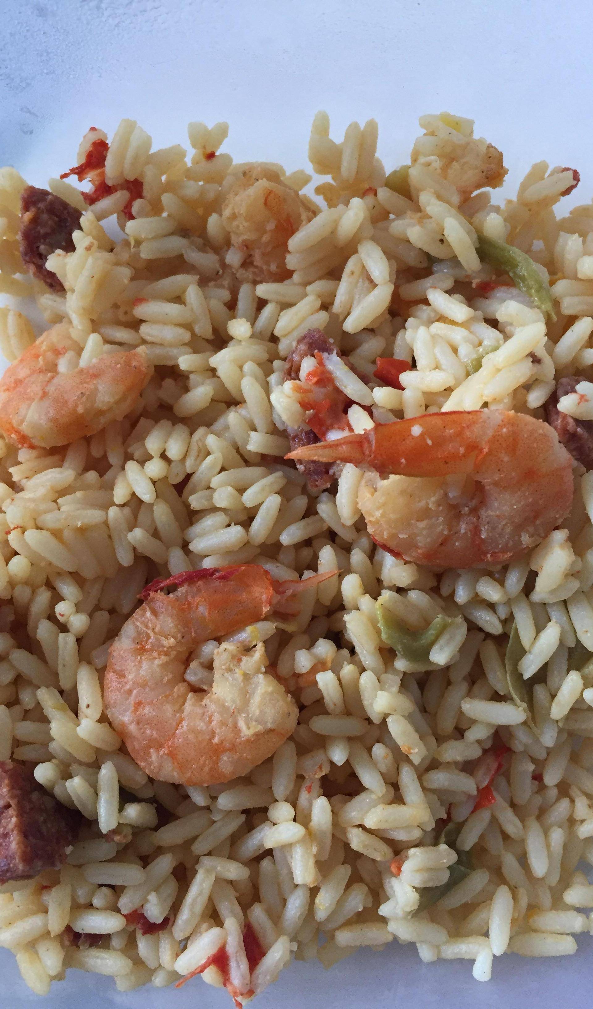 Faites revenir les crevettes, l'oignon, et le chorizo sans attendre le préchauffage.