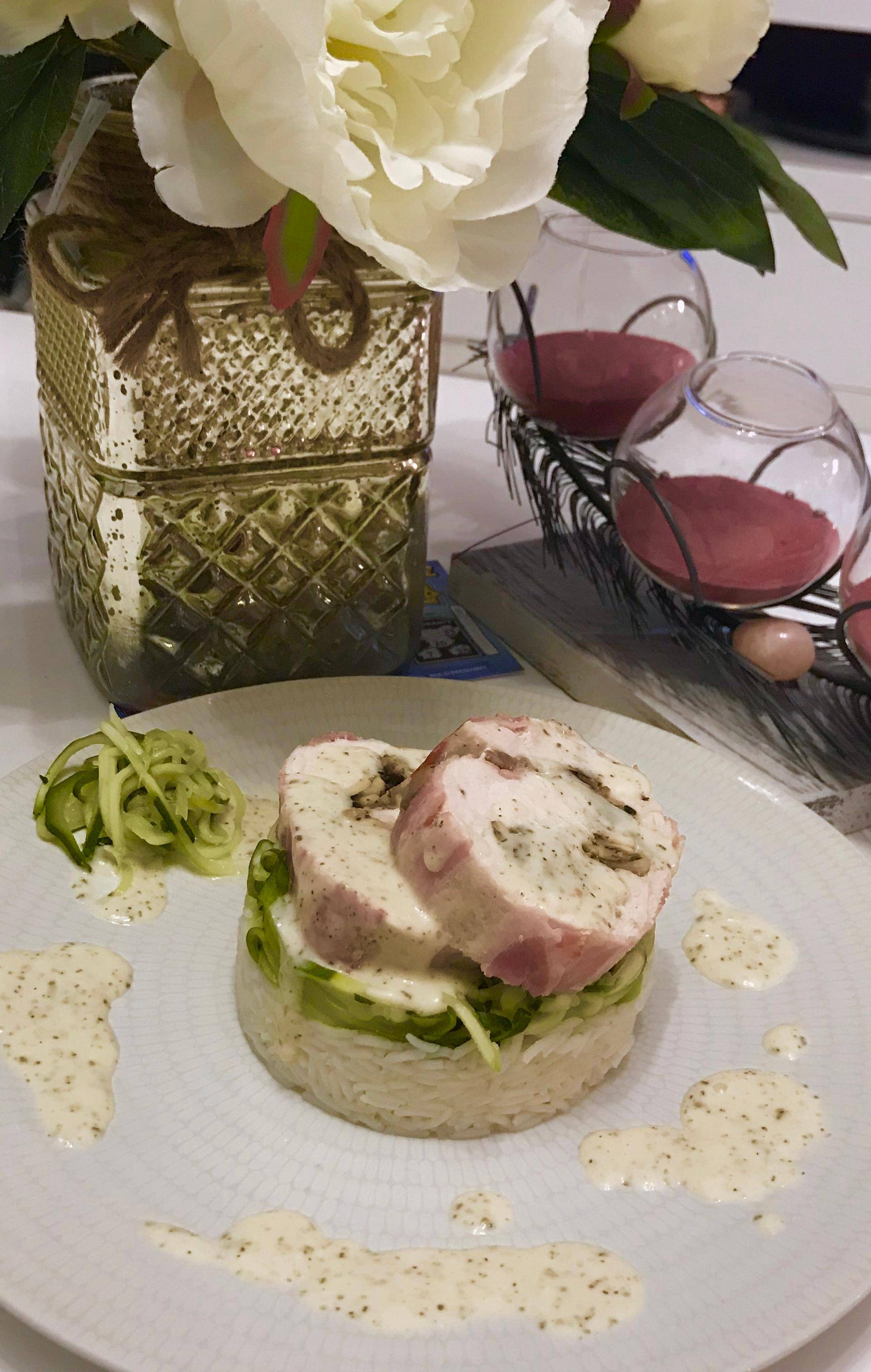 Tout est cuit, il vous reste plus qu’à dresser. Personnellement j’utilise un cercle. 1cm de riz environ 1 cm de courgettes Quelques gouttes de sauce Deux belles tranches de roulé (environ 1cm) Parsemer de sauce Déguster bien chaud :)