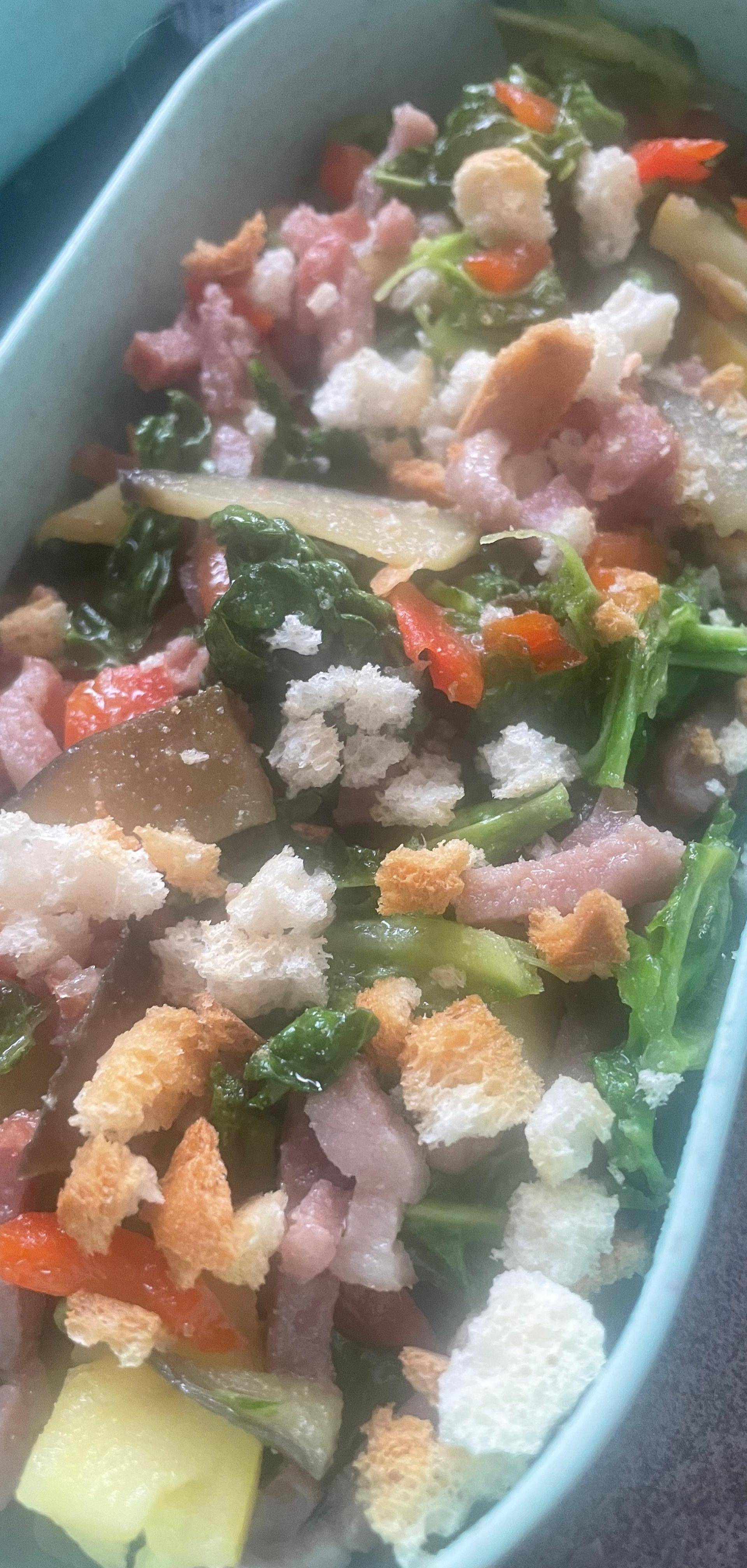 Faire revenir le chou vert, les lardons, aubergine, poivrons, oignon dans un filet d’huile d’olive et ajouter une pincée de sel et poivre. Mettre au frais 1h